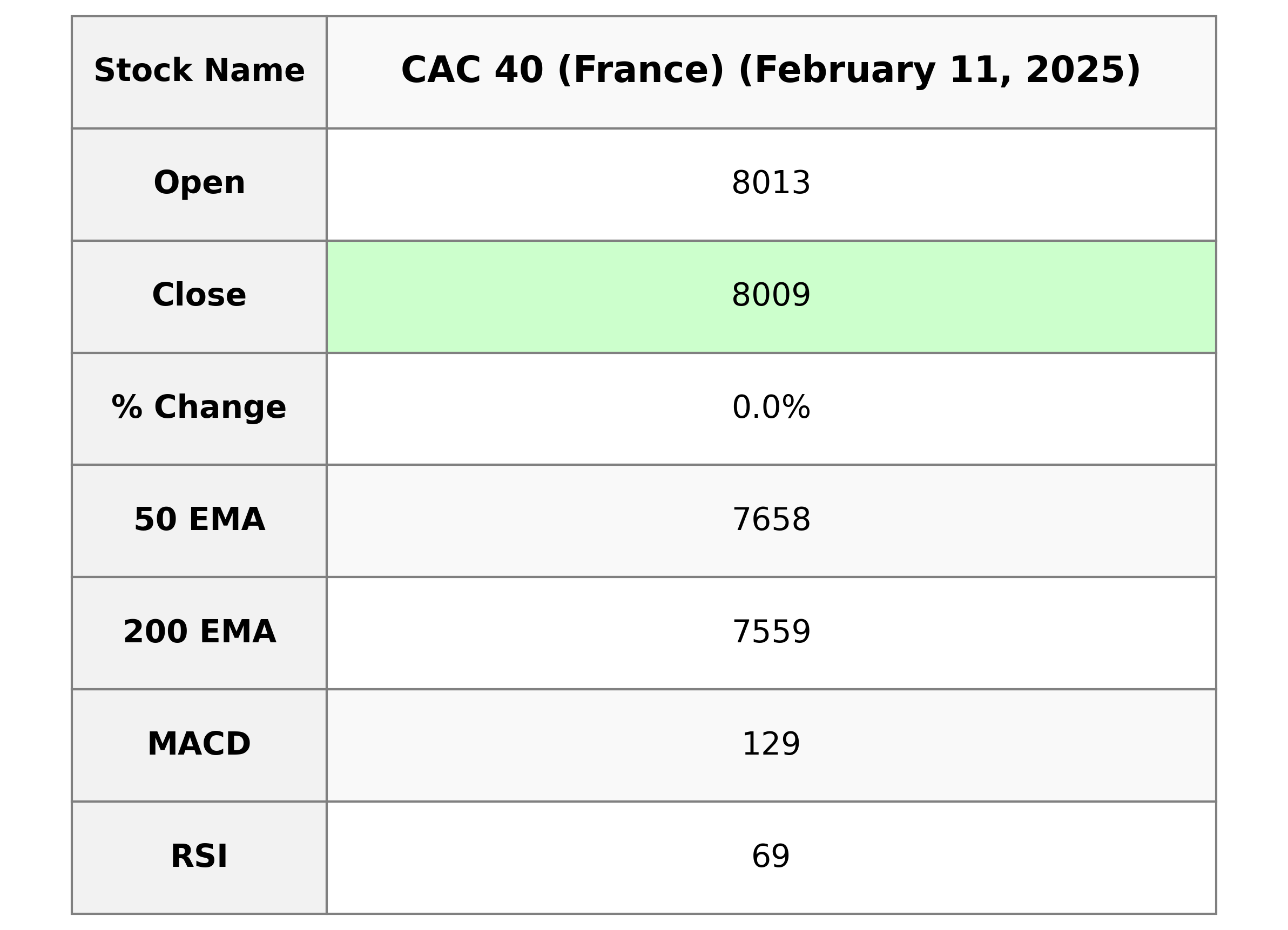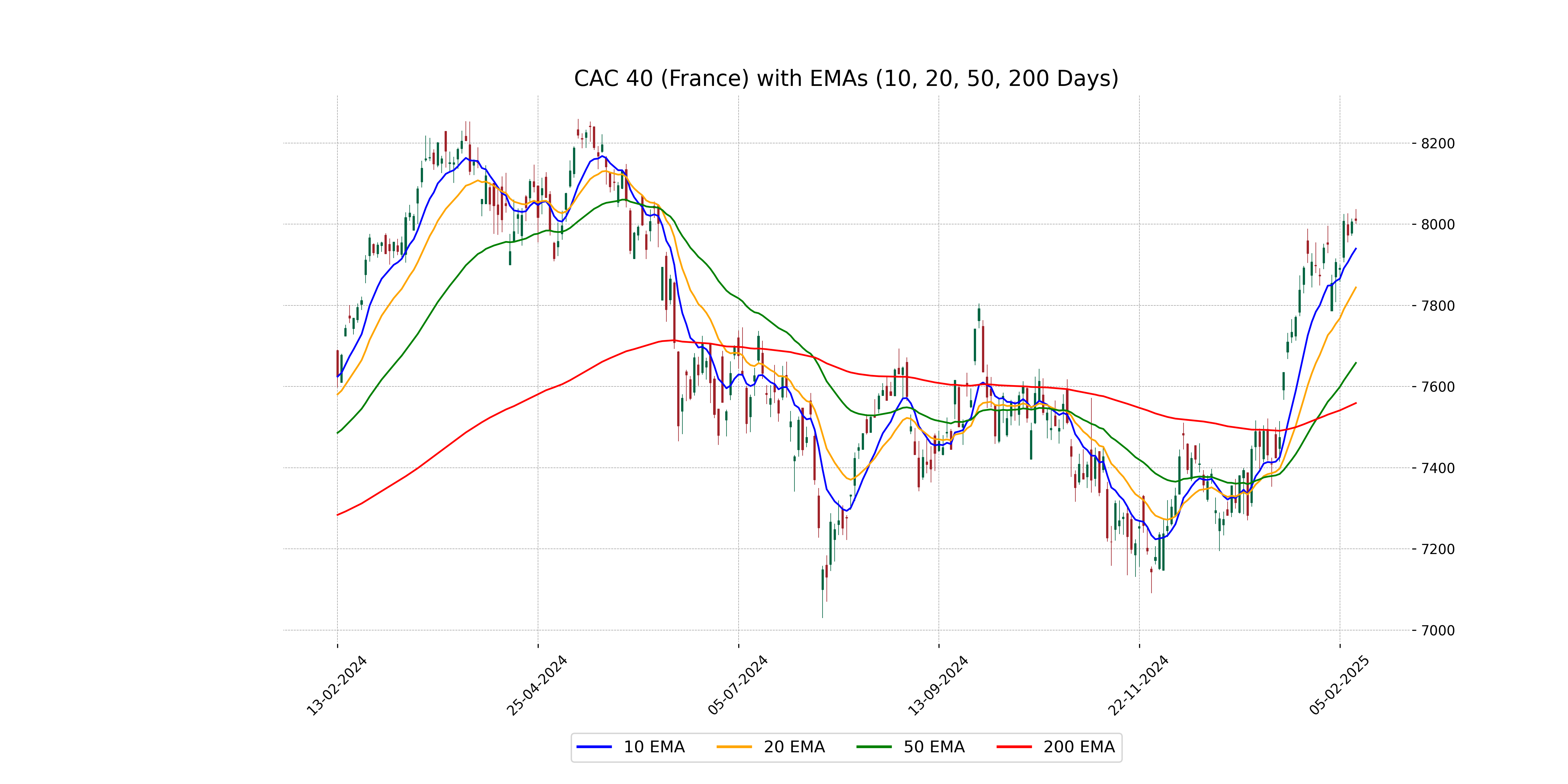 The closing price of CAC 40 is 8009.06, which is above its 50-EMA of 7658.32 and 200-EMA of 7559.32, indicating a strong short- to mid-term trend. The price is also above the 10-EMA and 20-EMA, suggesting continued bullish momentum in the near term.