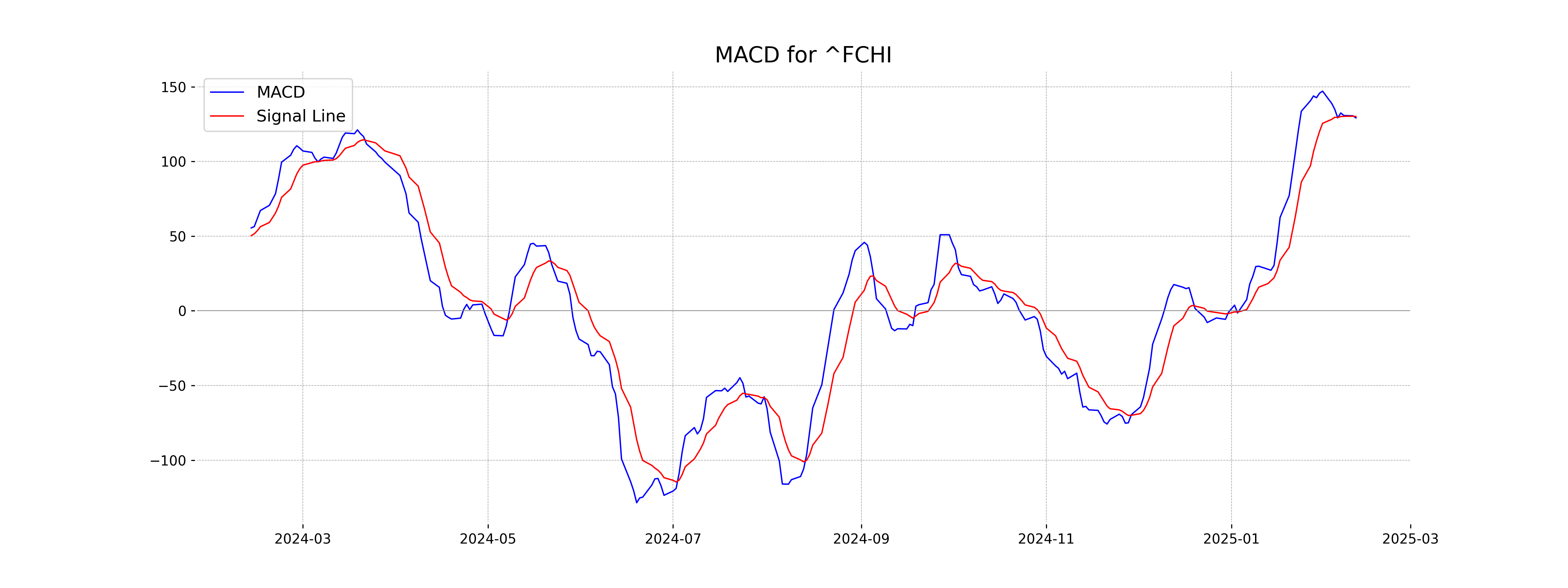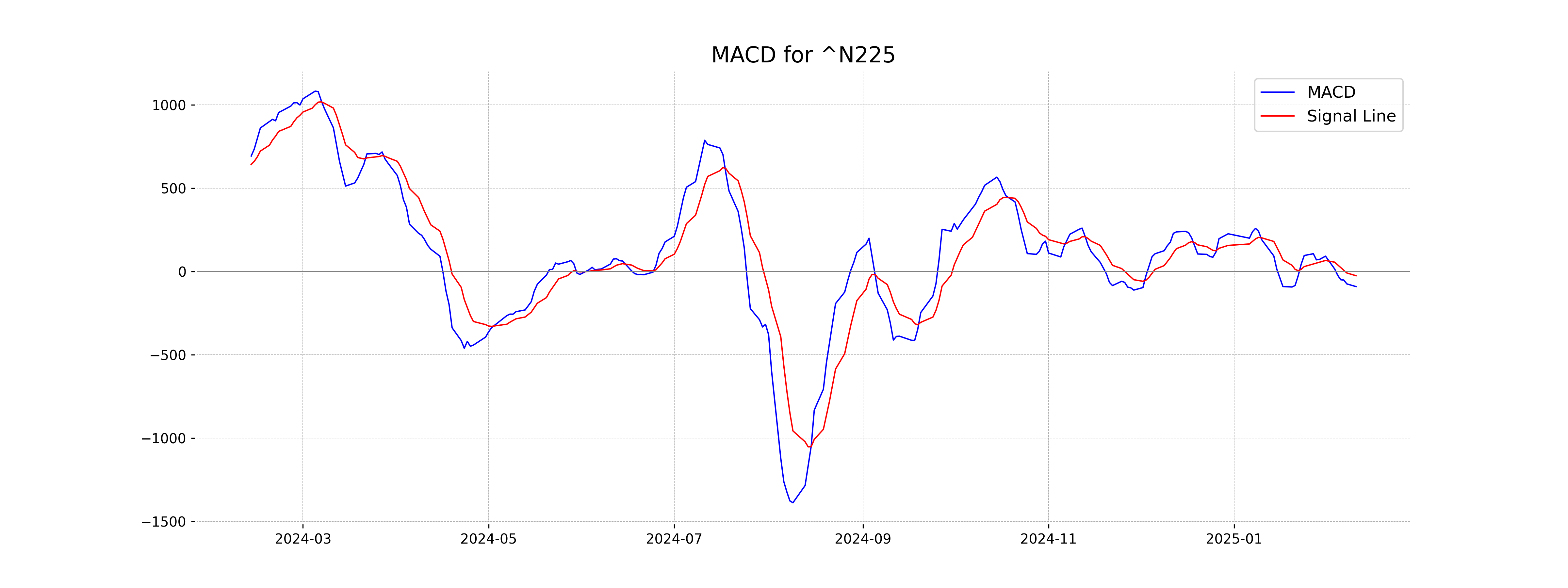 **MACD Analysis for Nikkei 225 (Japan):** The MACD value is -90.94, which is below the MACD signal line at -25.64, indicating a potential bearish trend. This suggests that the Nikkei 225 may experience downward momentum in the short term.