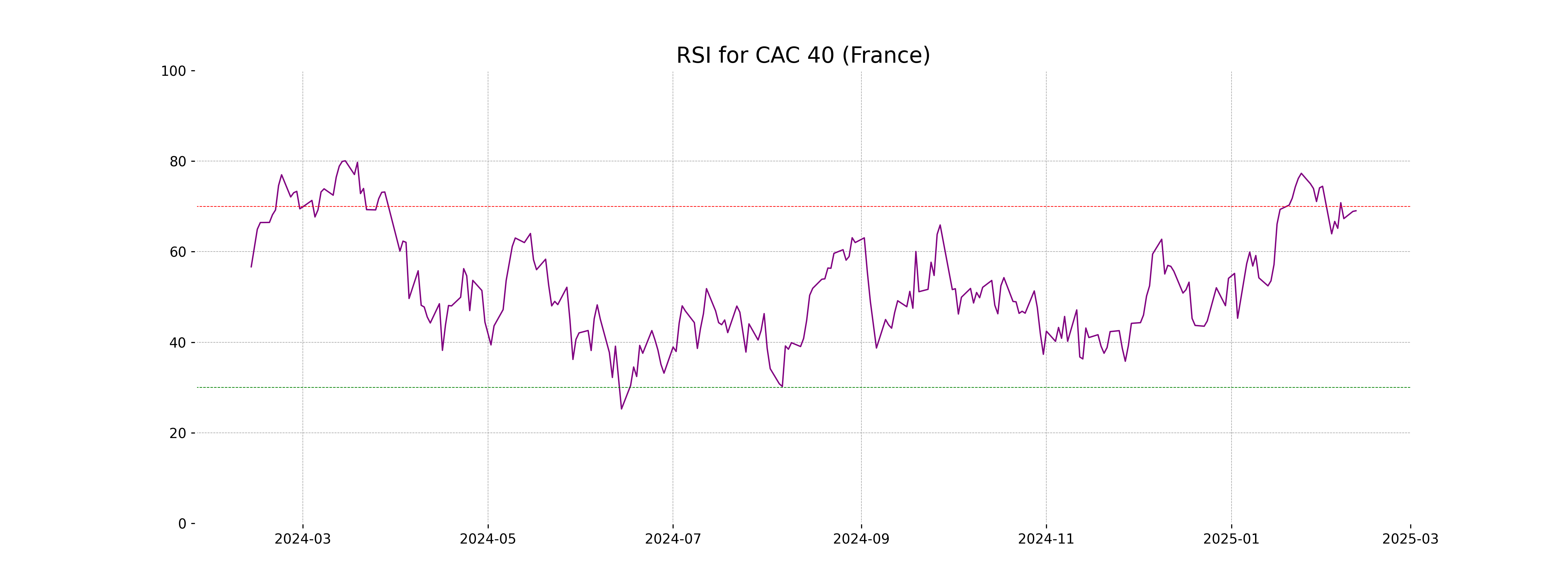 The RSI value for CAC 40 (France) is 69.03, indicating it is nearing the overbought territory, as RSI values above 70 typically suggest overbought conditions. This might imply a potential for consolidation or a price correction in the short term if it continues to rise.