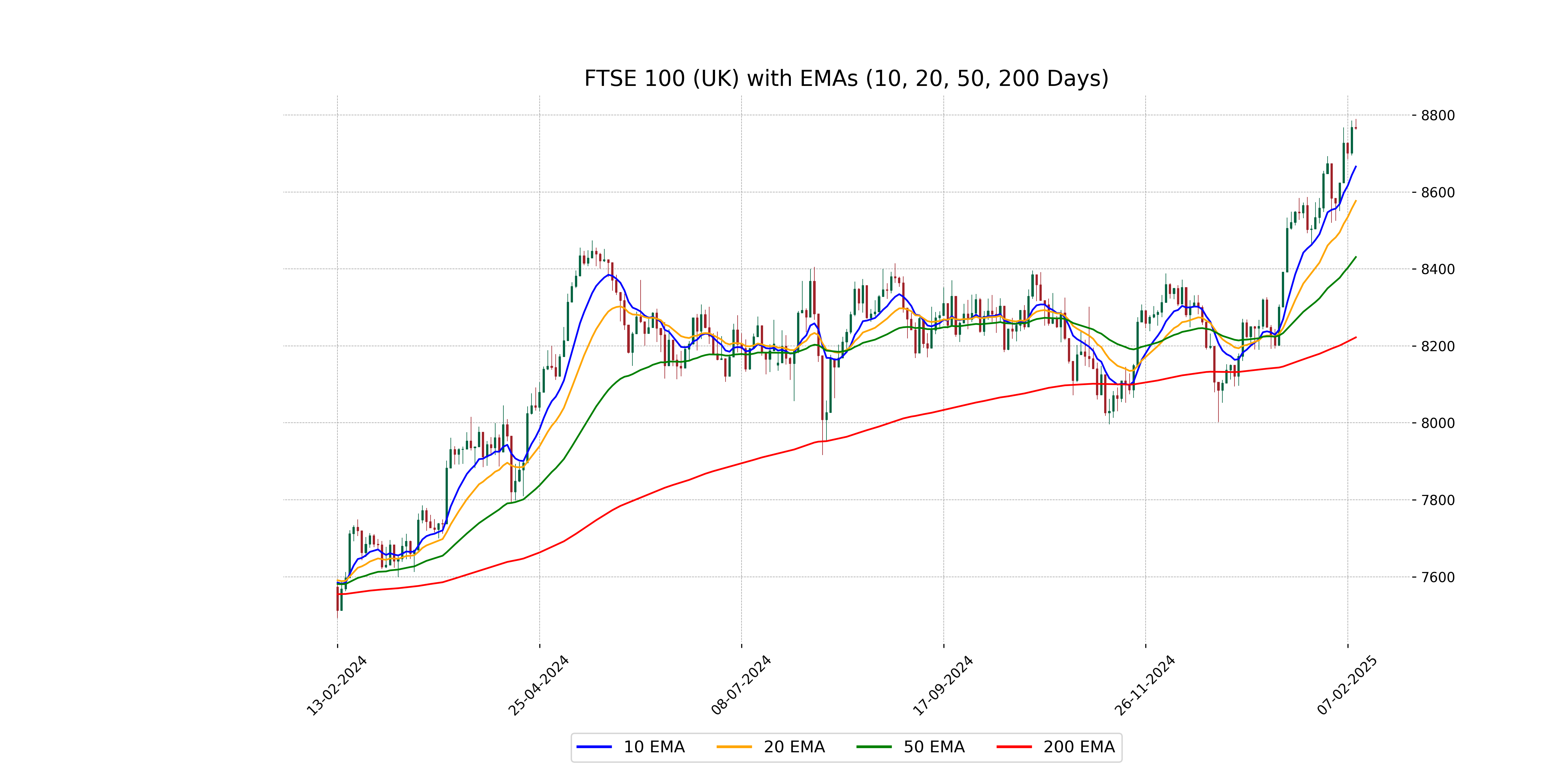 The closing price of FTSE 100 at 8765.66 is above the 50-day EMA of 8430.93, indicating a bullish trend compared to the medium-term average. Additionally, it is higher than both the 200-day EMA of 8222.15 and the 10-day EMA of 8666.06, suggesting strength in the current price relative to both long-term and short-term trends.