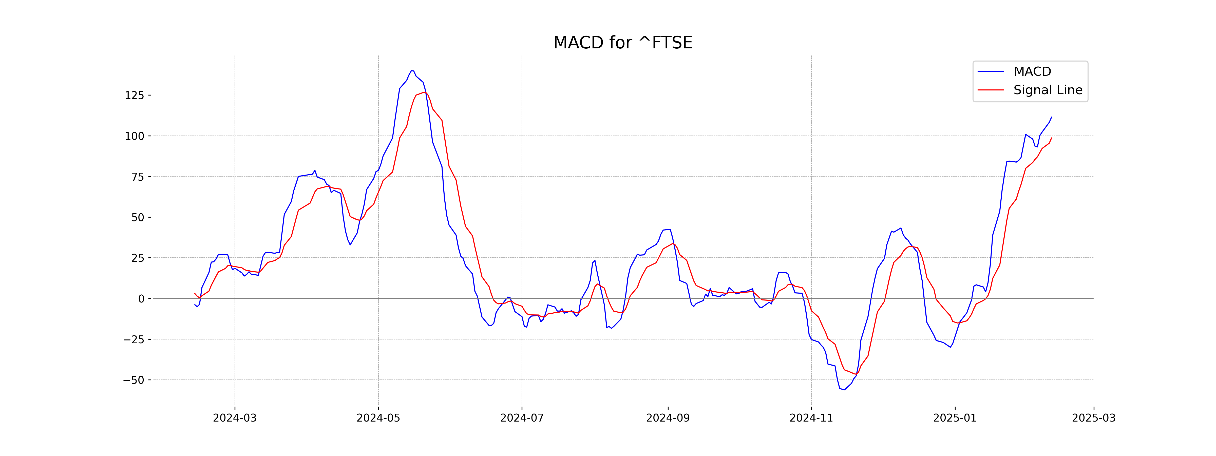 The FTSE 100 shows a bullish signal as the MACD line at 111.41 is above the MACD Signal line at 98.60, suggesting upward momentum. The high RSI value of 70.84 indicates that the index might be overbought, warranting cautiousness from traders.