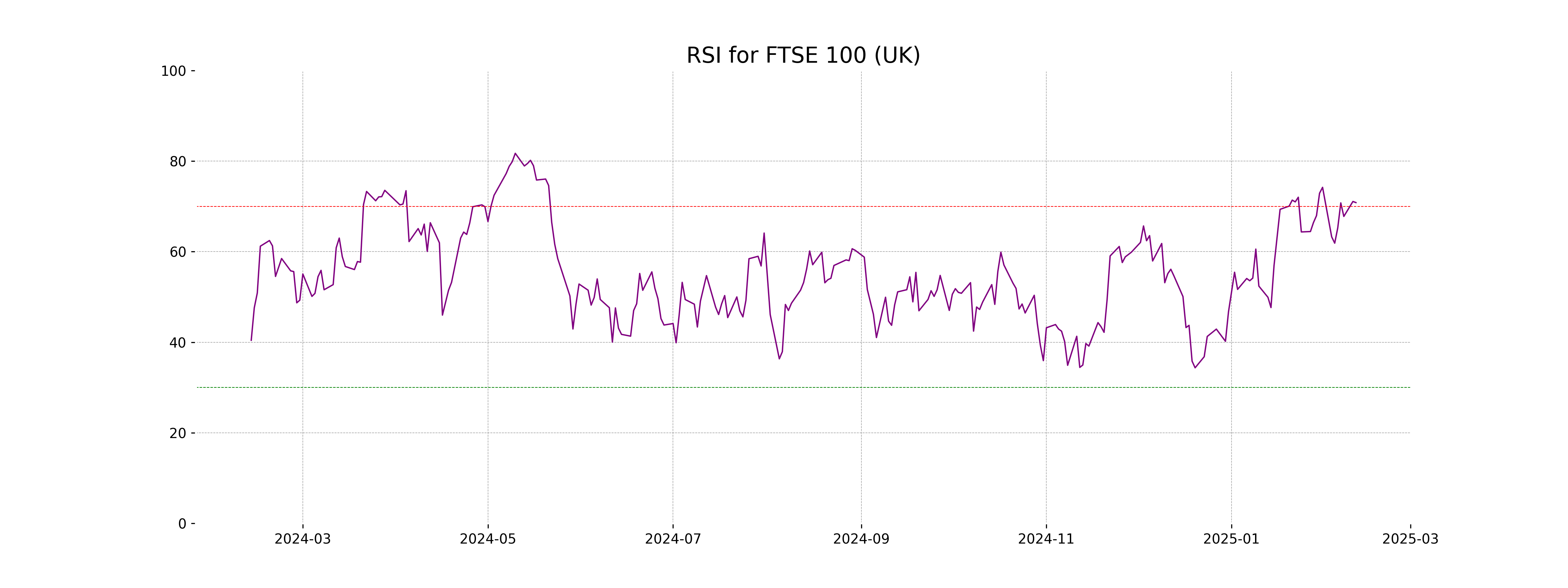 The RSI of FTSE 100 (UK) is 70.84, indicating that the index is approaching overbought territory. This suggests potential selling pressure, as values above 70 typically suggest that the stock might be overvalued and due for a pullback.