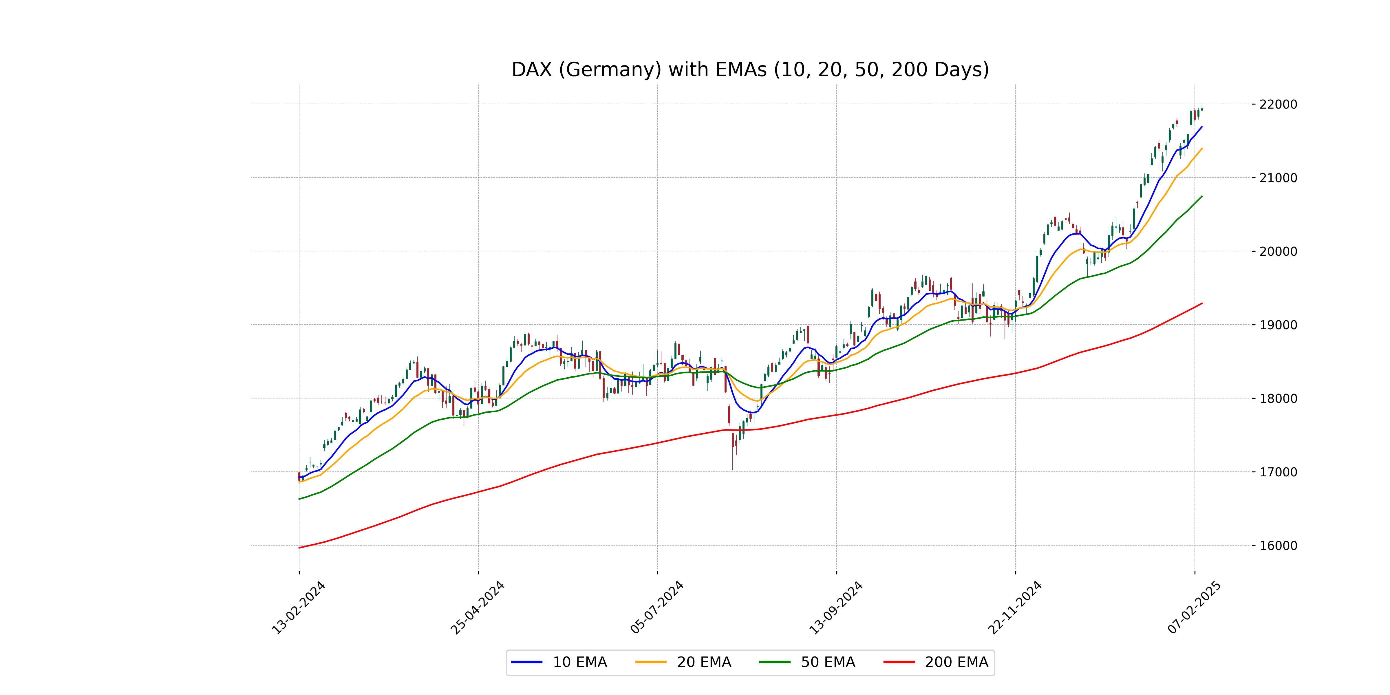The DAX (Germany) closed above its 10 EMA (21686.90) and 20 EMA (21392.28), indicating a short-term bullish trend. It is also trading significantly above its 50 EMA (20744.16) and 200 EMA (19289.10), suggesting a strong upward momentum over both medium and long-term periods.