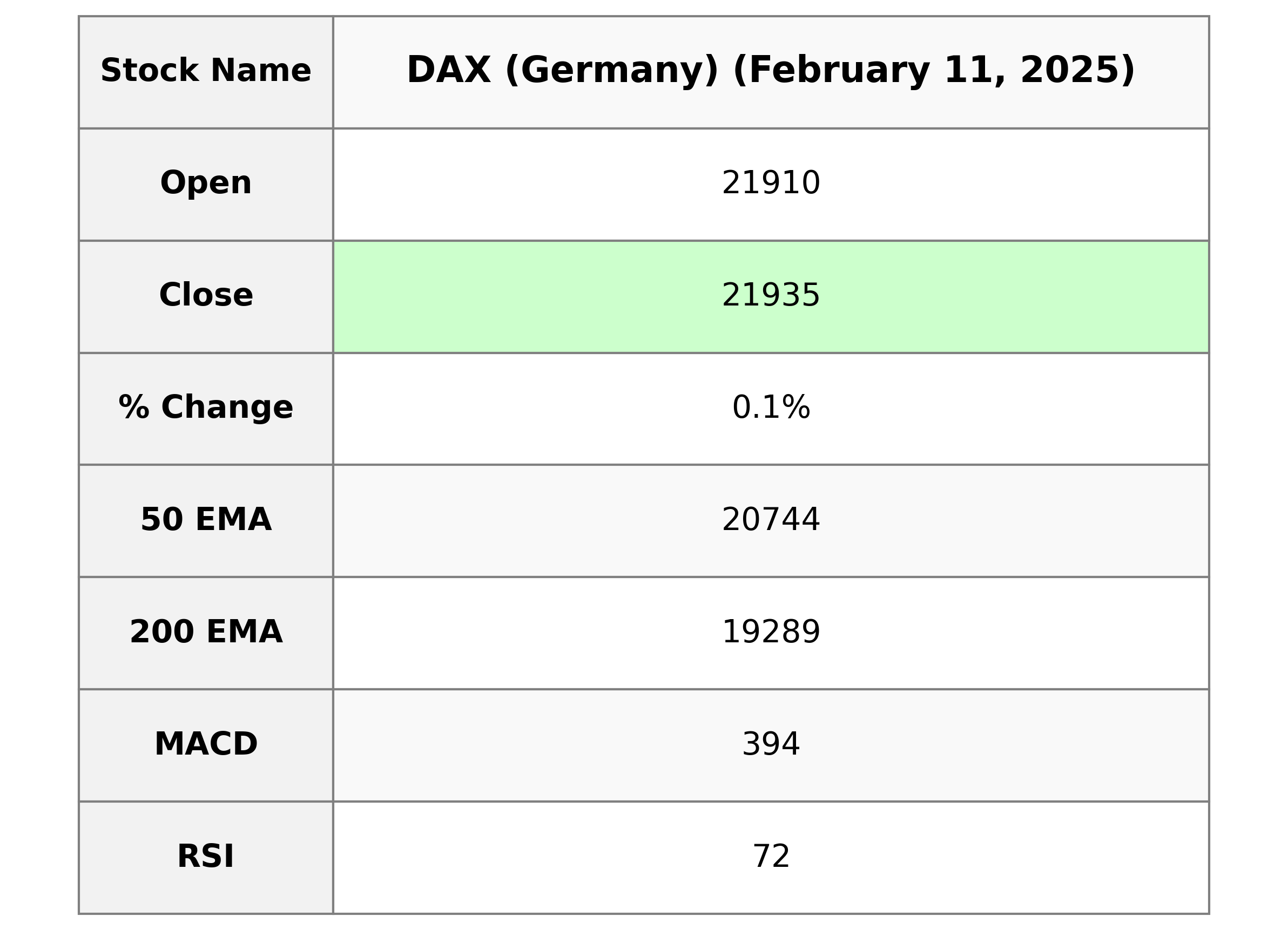 DAX (Germany) opened at 21,909.96, reaching a high of 21,977.18 and a low of 21,884.38, before closing at 21,934.57. The index experienced a 0.10% increase, with a points change of 22.83 from the previous close of 21,911.74. The RSI is at 72.15, signaling potential overbought conditions.