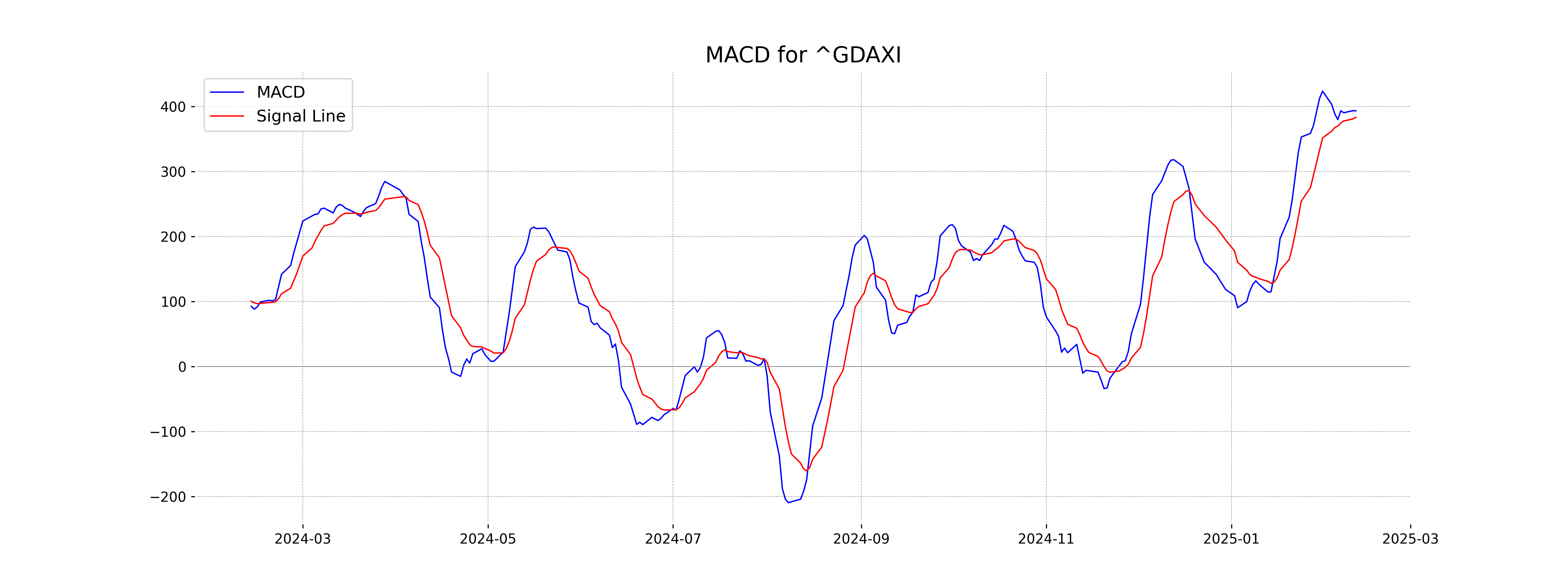The MACD analysis for DAX (Germany) shows a MACD value of 393.54, which is above the MACD signal line value of 383.57. This indicates a bullish trend, suggesting potential upward momentum in the index.