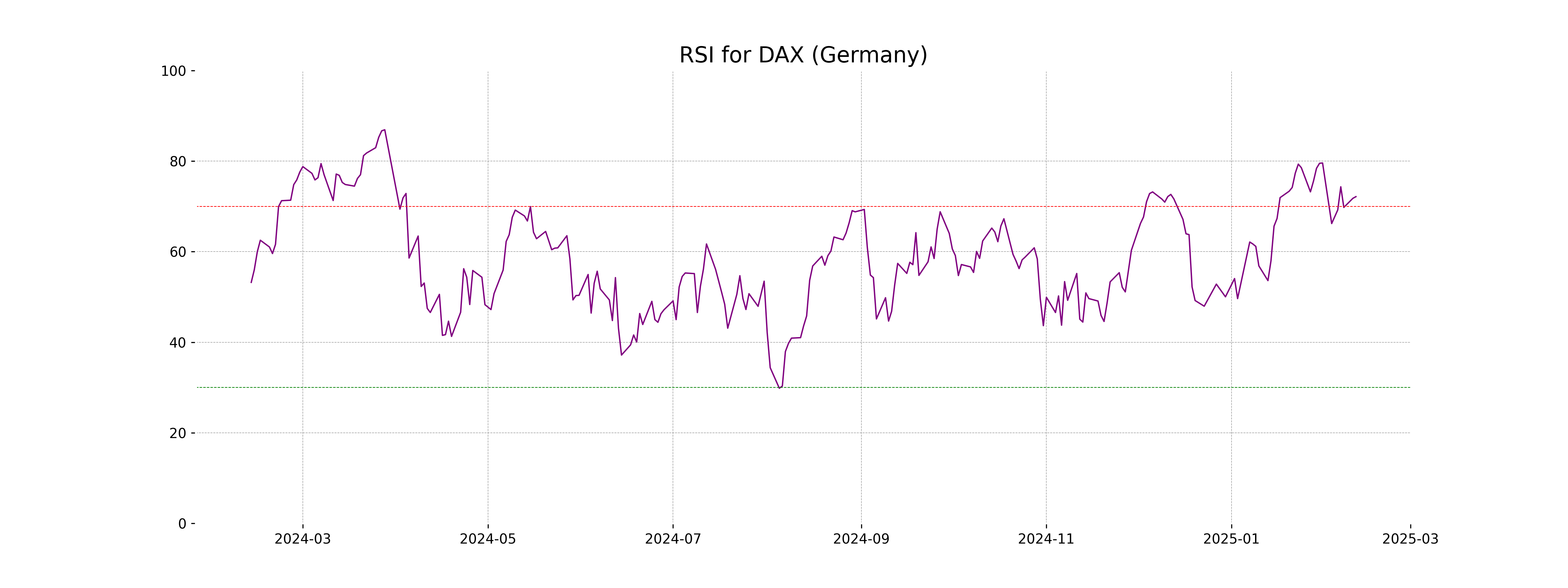 The RSI value for the DAX is 72.15, indicating that the index is in an overbought condition, as RSI values above 70 typically suggest such a status. This could imply a potential for a price pullback or correction in the near term.
