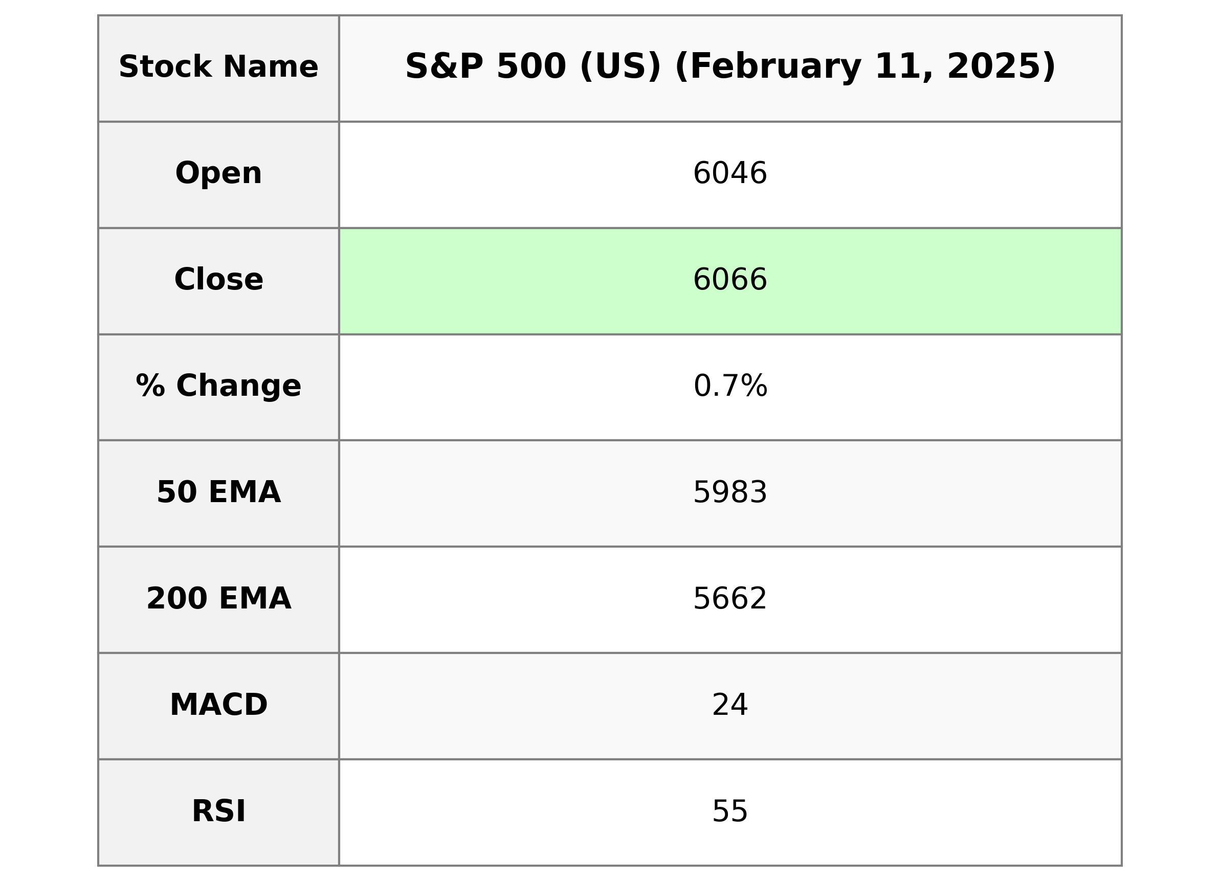 The S&P 500 opened at 6046.40 and closed at 6066.44, marking a percentage gain of 0.67% with a points increase of 40.45. The 10-day EMA stands at 6046.06, RSI is at 54.73, and the MACD is slightly above the signal line, indicating a mildly positive momentum in the market.