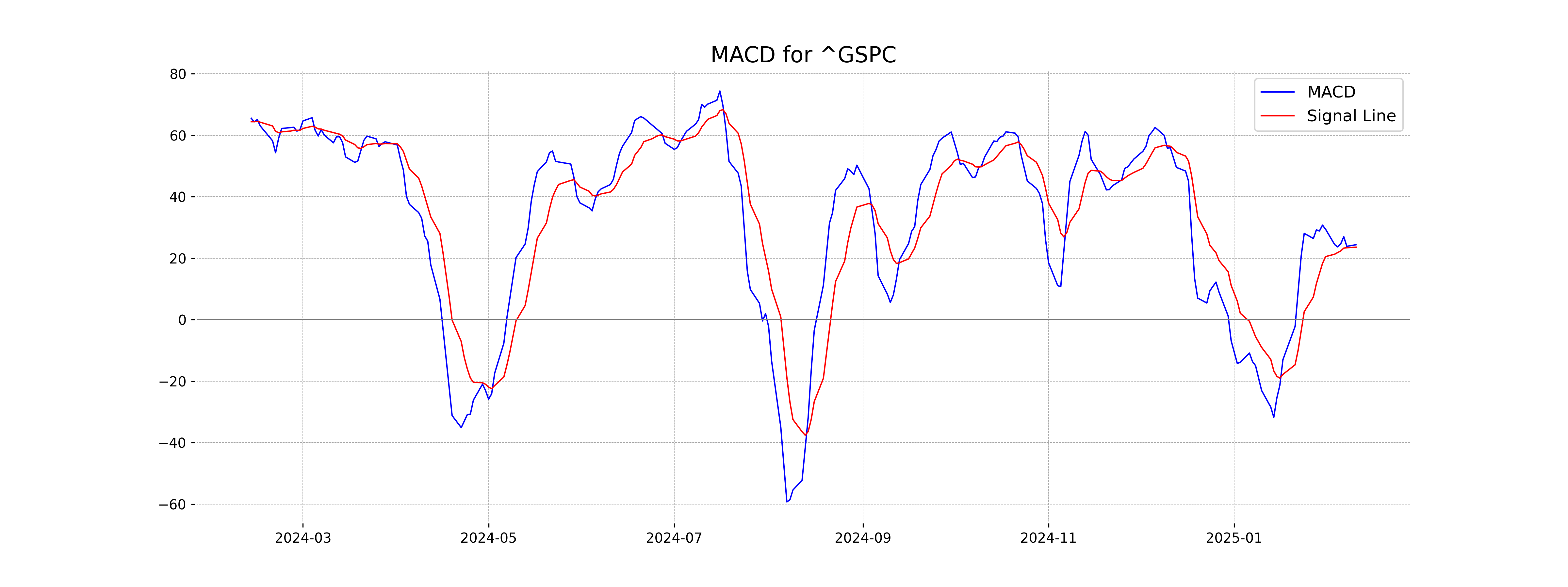 The MACD value for S&P 500 is 24.37, which is higher than the MACD Signal line at 23.59. This indicates a potential bullish trend, suggesting that the momentum might favor upward price movement.