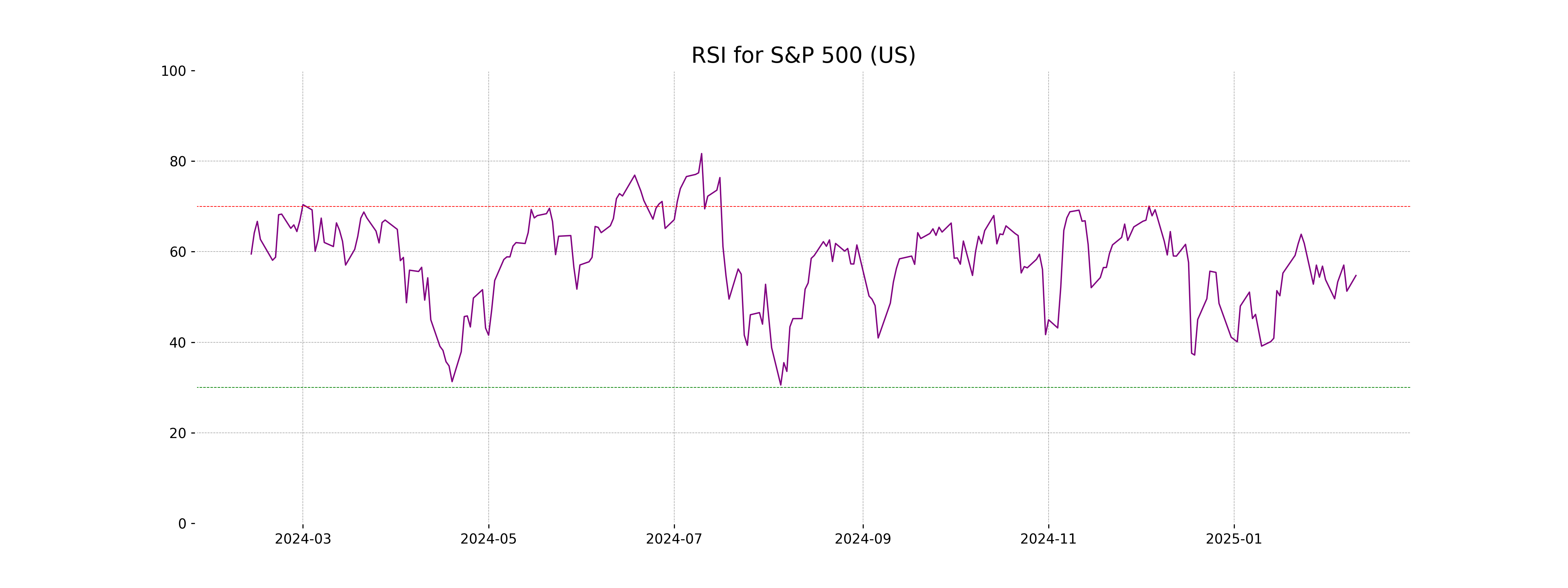 The RSI for S&P 500 is currently 54.73, indicating a neutral momentum, as it is neither in the overbought (>70) nor oversold (<30) range. This suggests that the market could be trading relatively sideways or is in a mild uptrend.