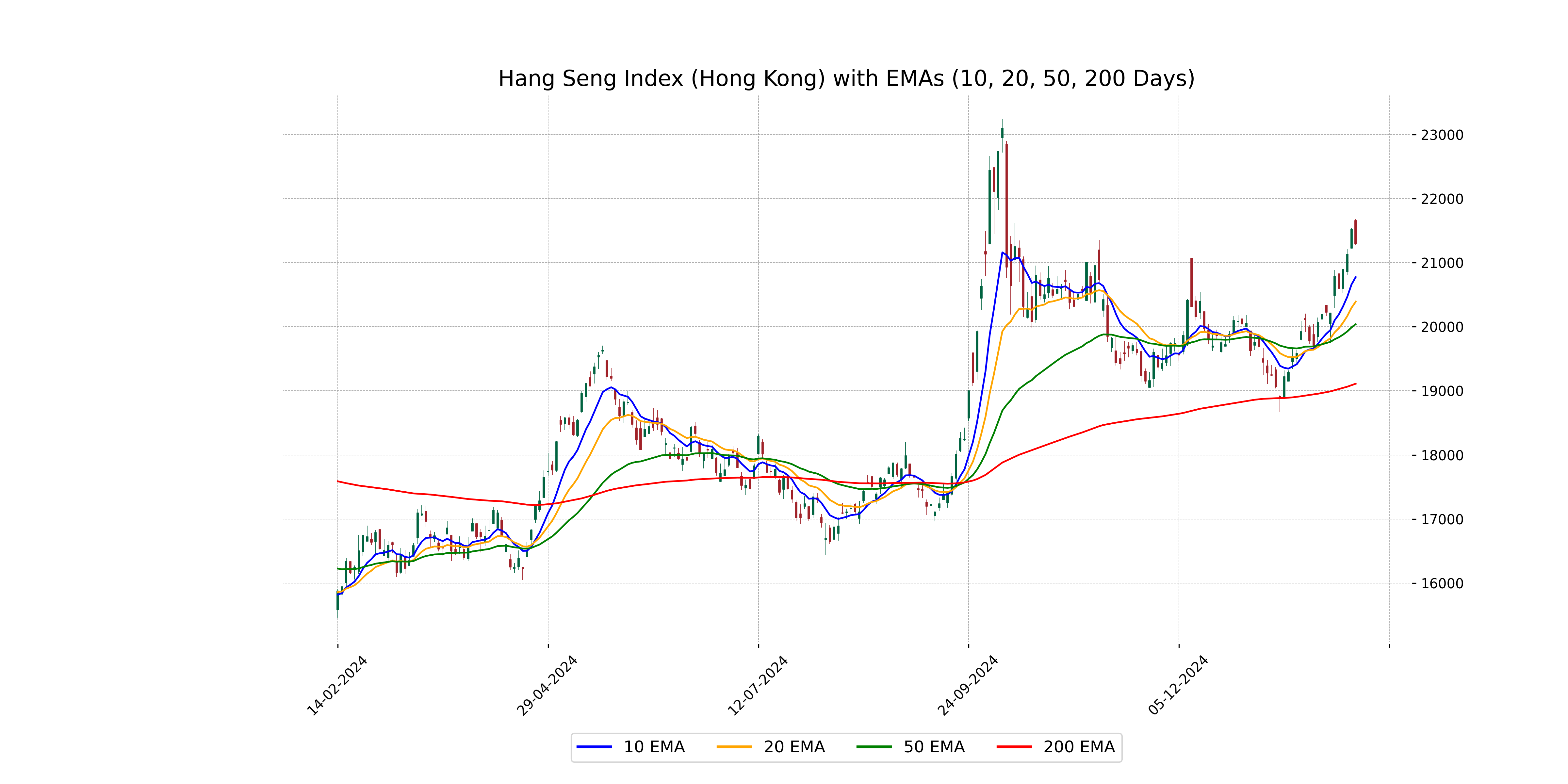 The Hang Seng Index is currently closing at 21,294.86, above its 50-day EMA of 20,040.45 and 200-day EMA of 19,111.36, indicating a bullish trend in both short-term and long-term perspectives. Additionally, it is positioned above the 10-day EMA of 20,774.82 and the 20-day EMA of 20,390.83, suggesting strong recent upward momentum.