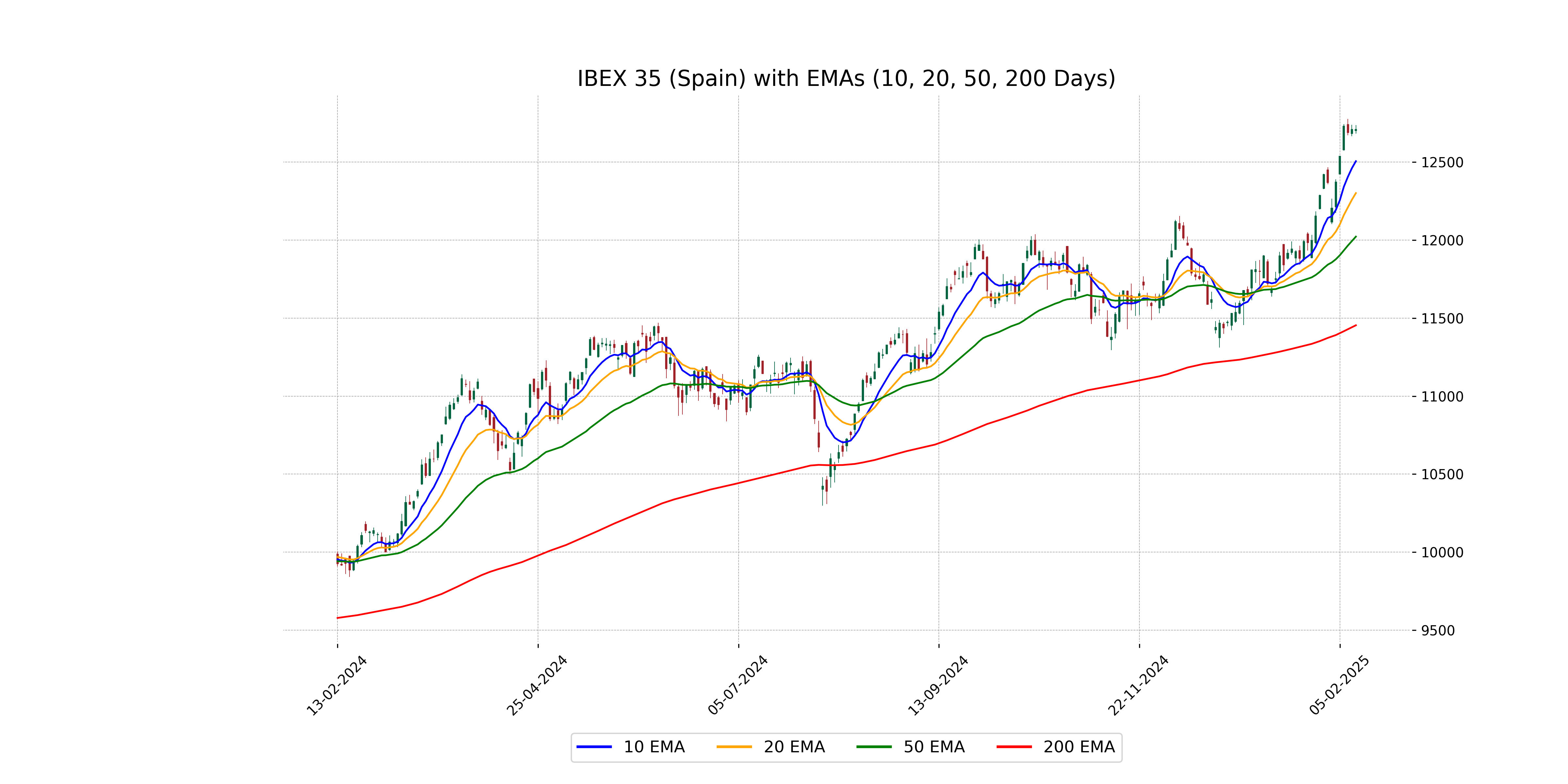 The IBEX 35 (Spain) is currently trading above its 10-day EMA of 12505.39, 20-day EMA of 12301.05, 50-day EMA of 12022.05, and 200-day EMA of 11453.86, indicating a strong upward trend in the short to long term despite a slight drop today.