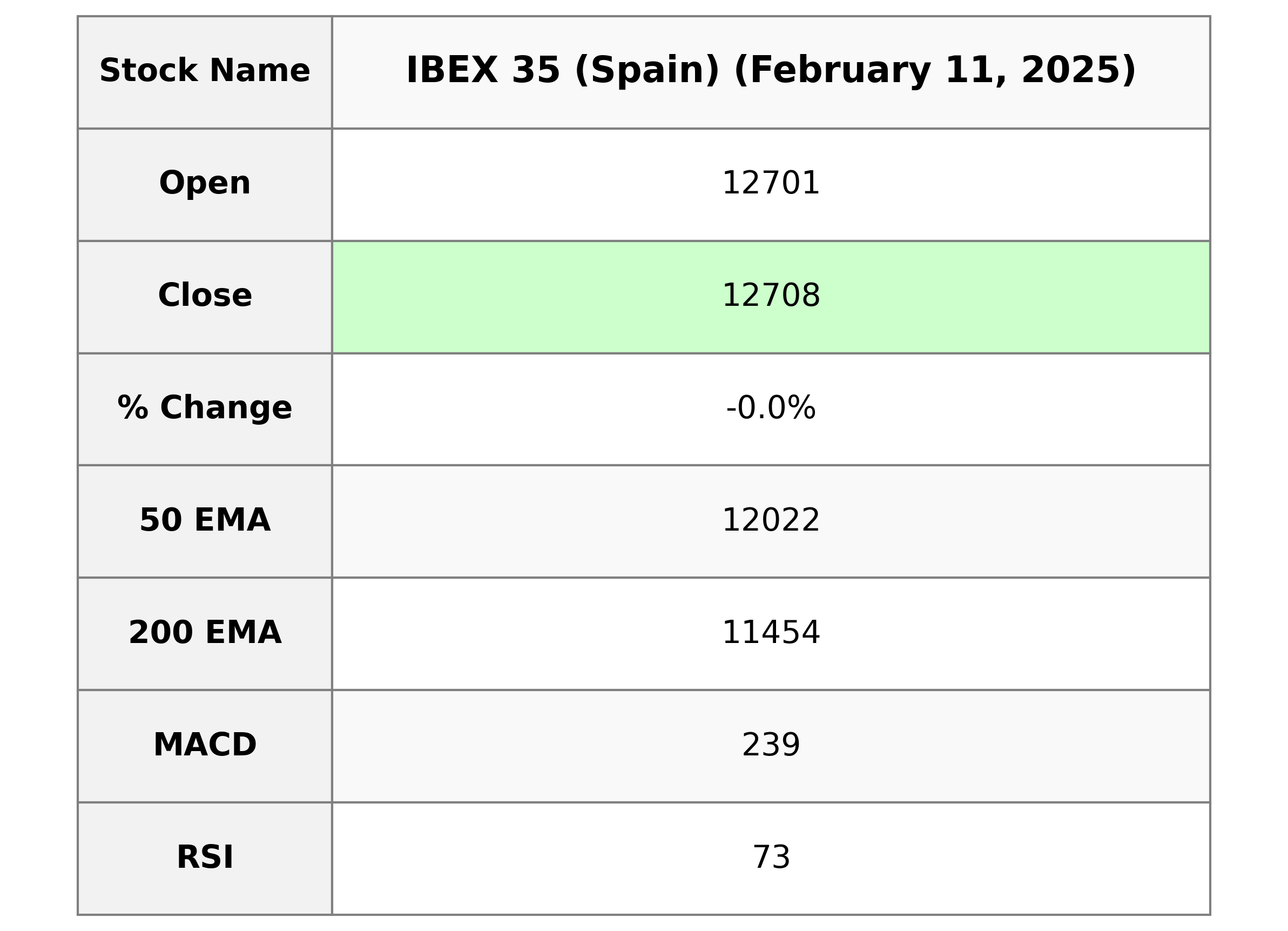The IBEX 35 index opened at 12,700.70 and closed slightly lower at 12,708.40, showing a minor percentage change of -0.0031%. The index has a high RSI of 73.07, indicating it is in overbought territory. The current metrics suggest it is above the 50-day (12,022.05) and 200-day (11,453.86) exponential moving averages, showing a strong upward trend.