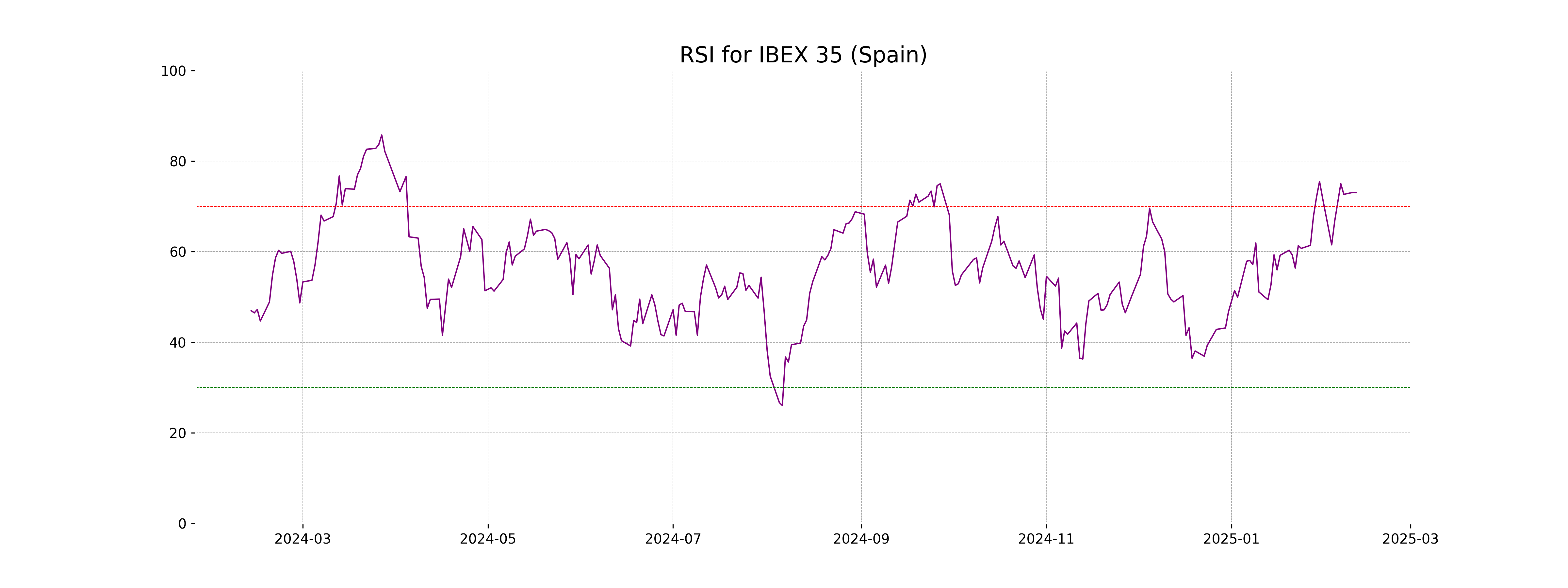 The current RSI for the IBEX 35 index is 73.07, indicating that it is in the overbought territory. This suggests that the index may be experiencing a higher buying pressure, and a potential price correction could be expected in the near term.