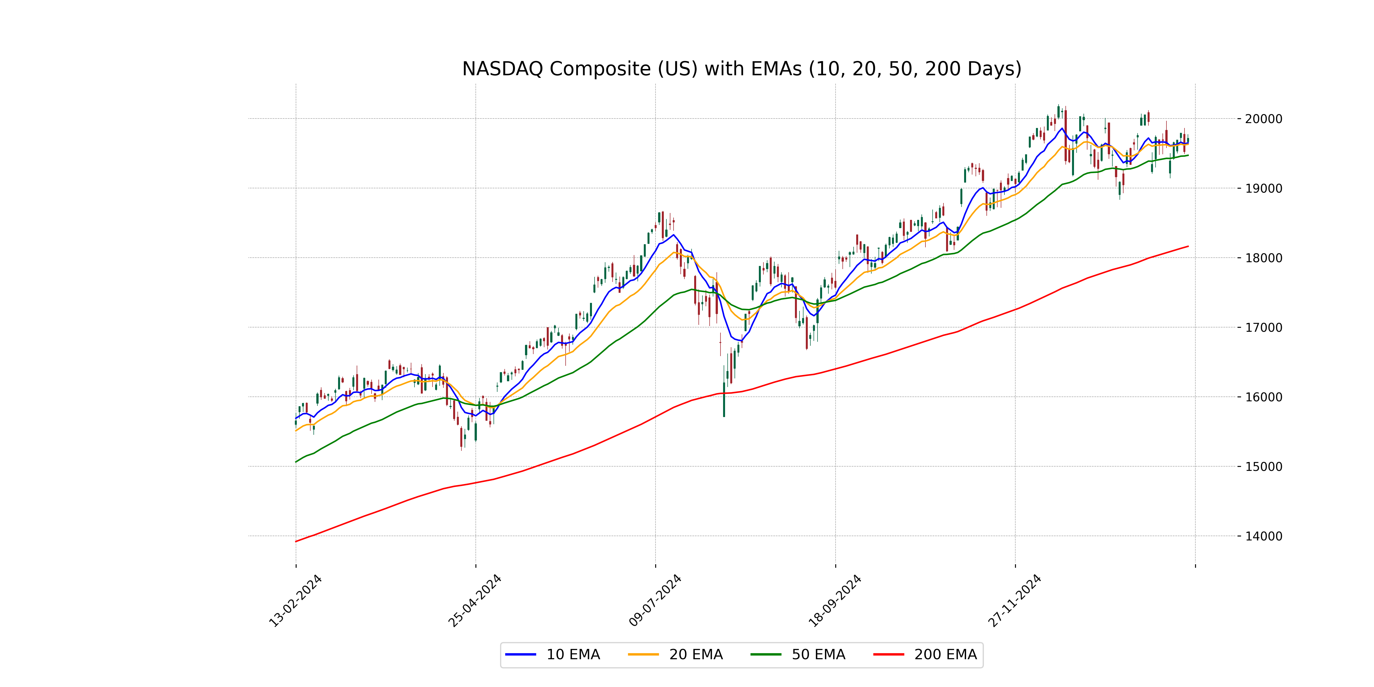 The NASDAQ Composite opened above both the 50-day and 200-day EMAs, indicating a positive short-term and long-term trend. The closing price was also above the 10-day and 20-day EMAs, suggesting a potential continuation of the uptrend. The MACD being above its signal line supports this bullish sentiment.