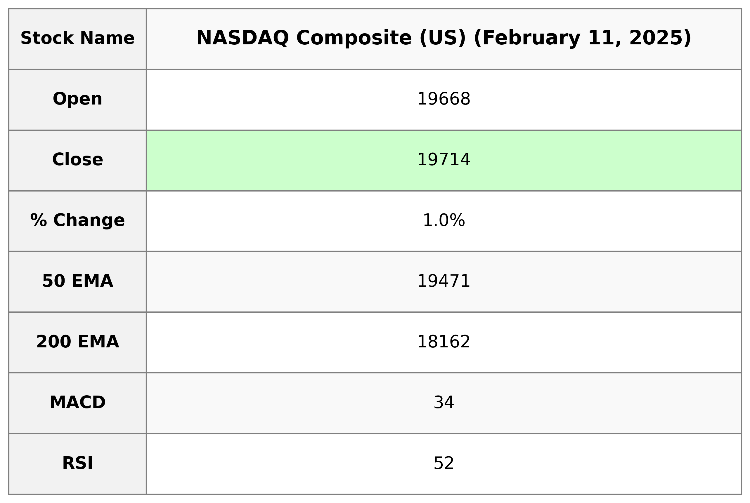 The NASDAQ Composite (US) opened at 19,668.18 and closed at 19,714.27, marking a 0.98% increase with a points change of 190.87. The trading volume was 9.53 billion, and key moving averages indicate a positive momentum, with a 50-day EMA of 19,471.25 and a MACD slightly below its signal.