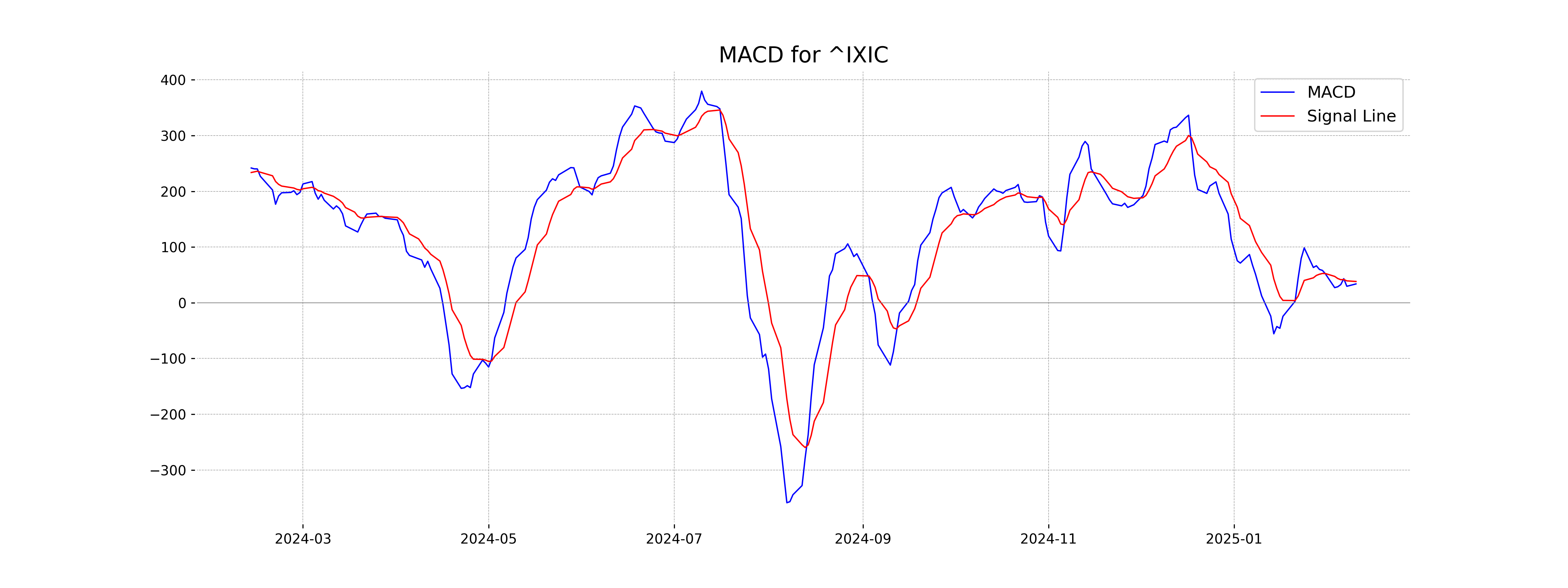 The MACD for NASDAQ Composite is at 33.83, while the MACD Signal is at 38.23, indicating a bearish crossover. This suggests that there might be a potential downtrend or a slowdown in upward momentum in the short term.