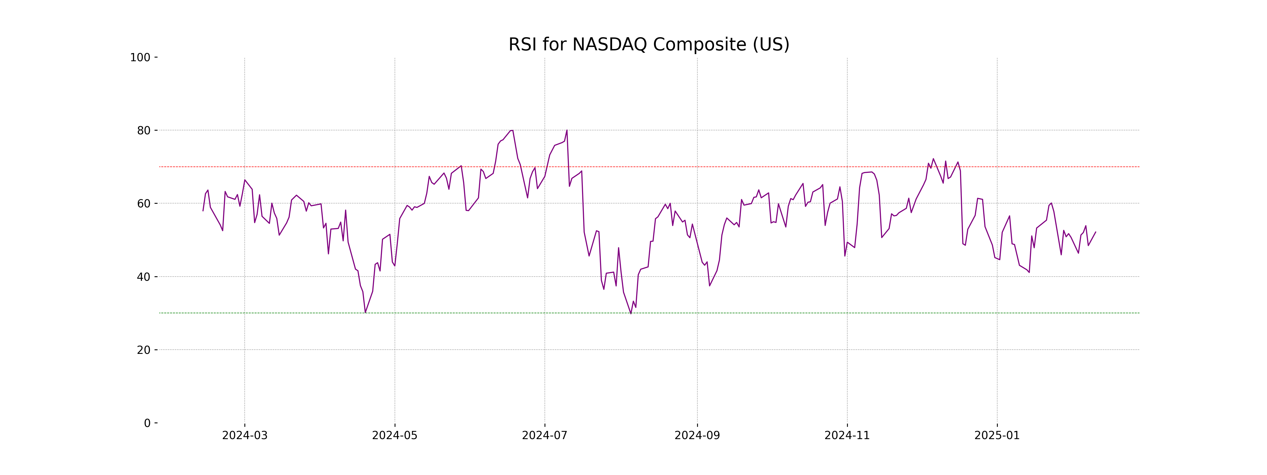 The RSI for NASDAQ Composite is 52.14, which indicates a neutral market sentiment. Since RSI values above 70 denote overbought conditions and below 30 indicate oversold conditions, the current level suggests that the index is not exhibiting extreme trading behaviors.