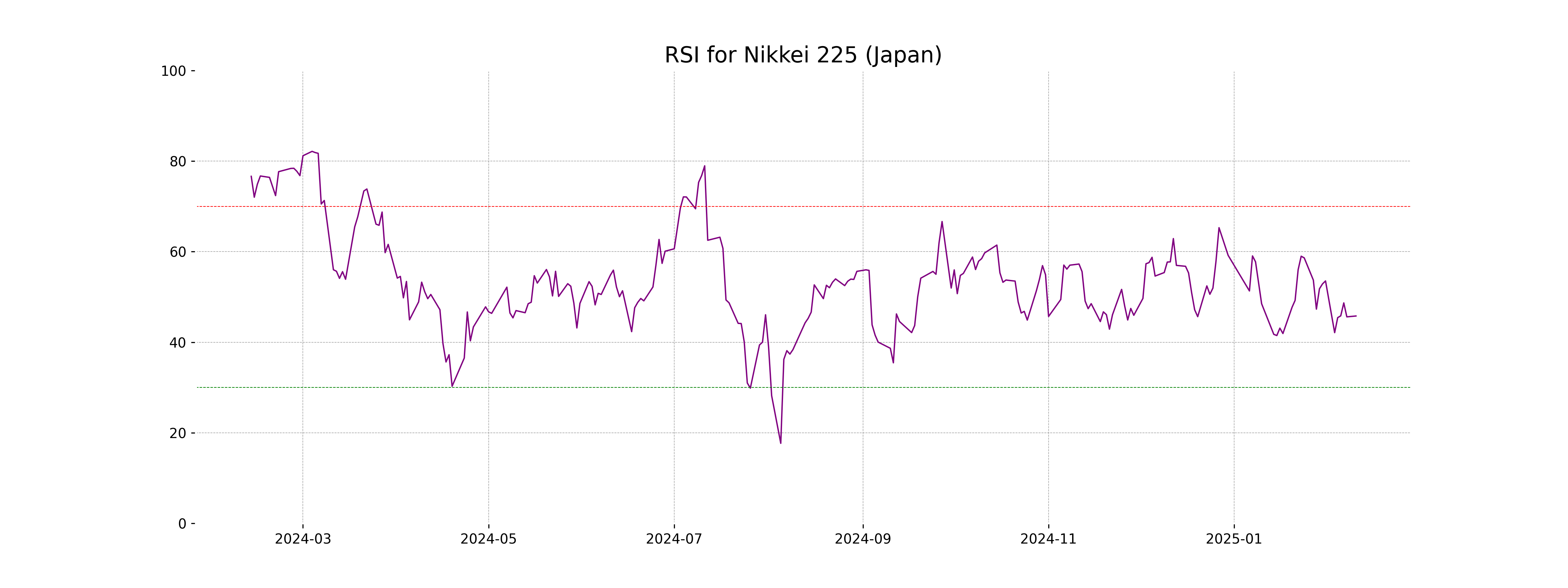 The Relative Strength Index (RSI) for Nikkei 225 stands at 45.79, indicating a neutral stance as it resides between the generally oversold level of 30 and overbought level of 70. This suggests that the market is neither in the overbought nor oversold condition, reflecting a balanced momentum in the recent price action.
