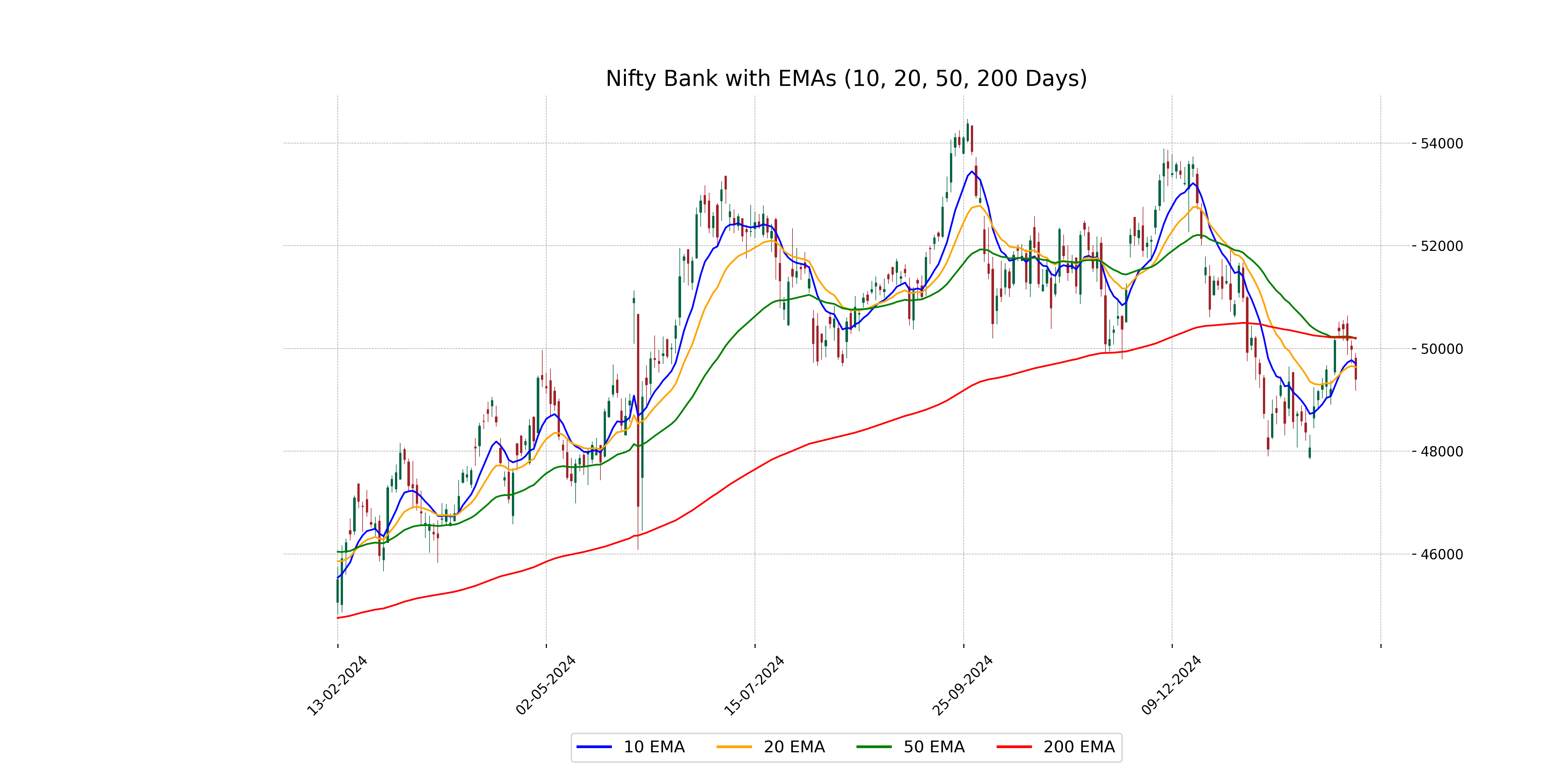 The Nifty Bank is currently trading below its key moving averages, with its last closing price of 49,403.40 being lower than the 50 EMA of 50,191.89, the 200 EMA of 50,207.52, the 10 EMA of 49,705.23, and the 20 EMA of 49,636.35. This indicates a bearish short-term trend as the index is below the critical average benchmarks.