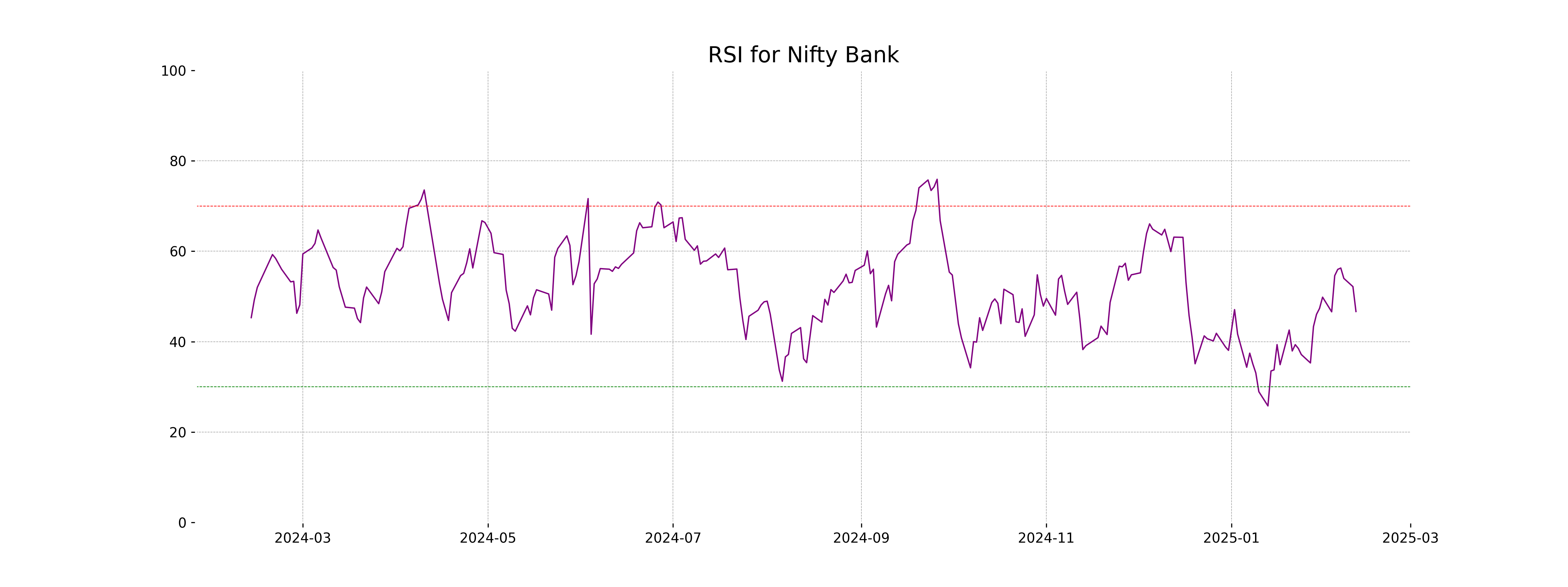 The RSI value for Nifty Bank is 46.66, indicating that the stock is in the neutral zone, neither overbought nor oversold. Traders generally interpret an RSI below 30 as a potential buying opportunity and above 70 as a potential selling point; thus, Nifty Bank's current RSI suggests neither extreme condition.