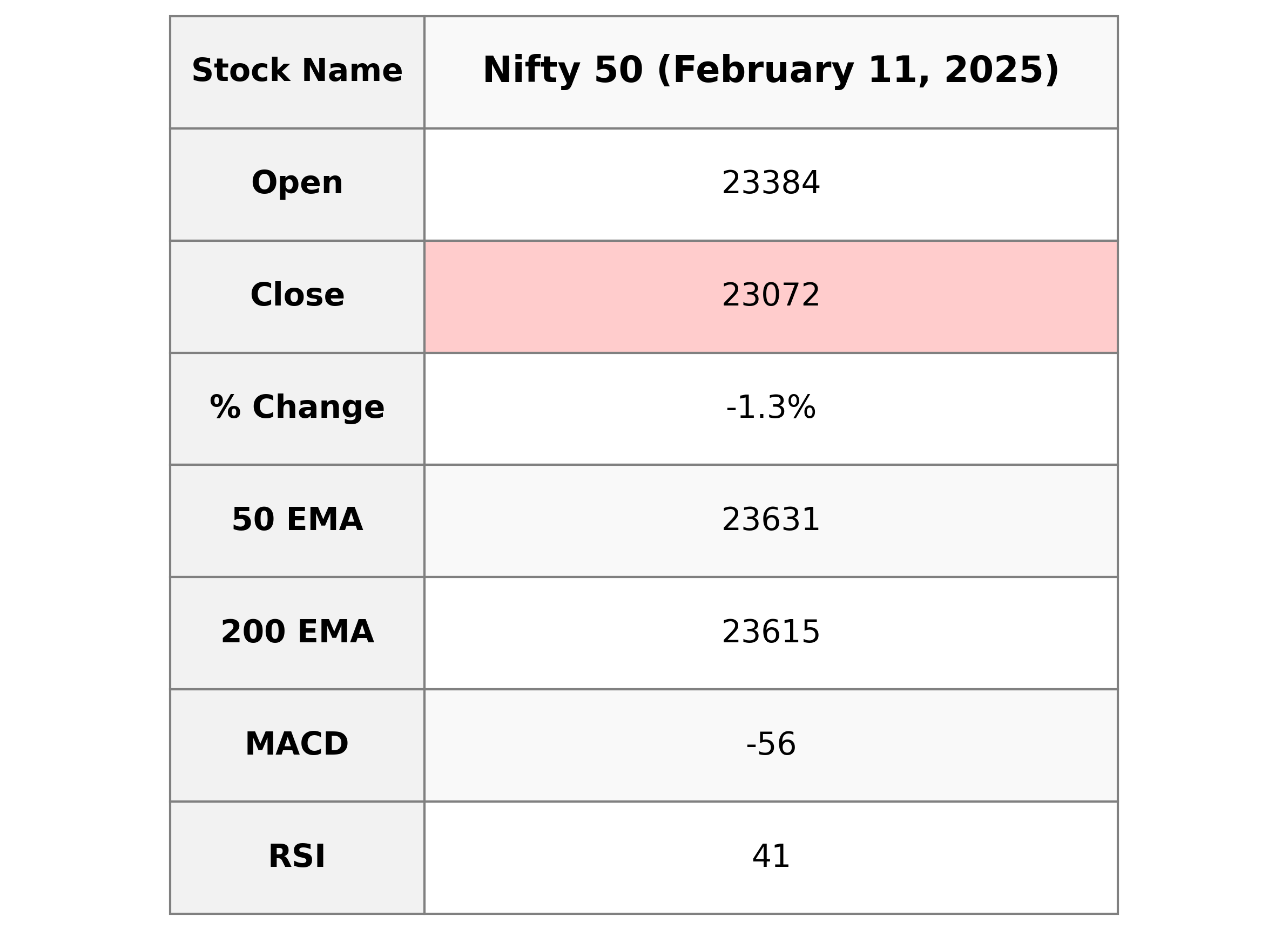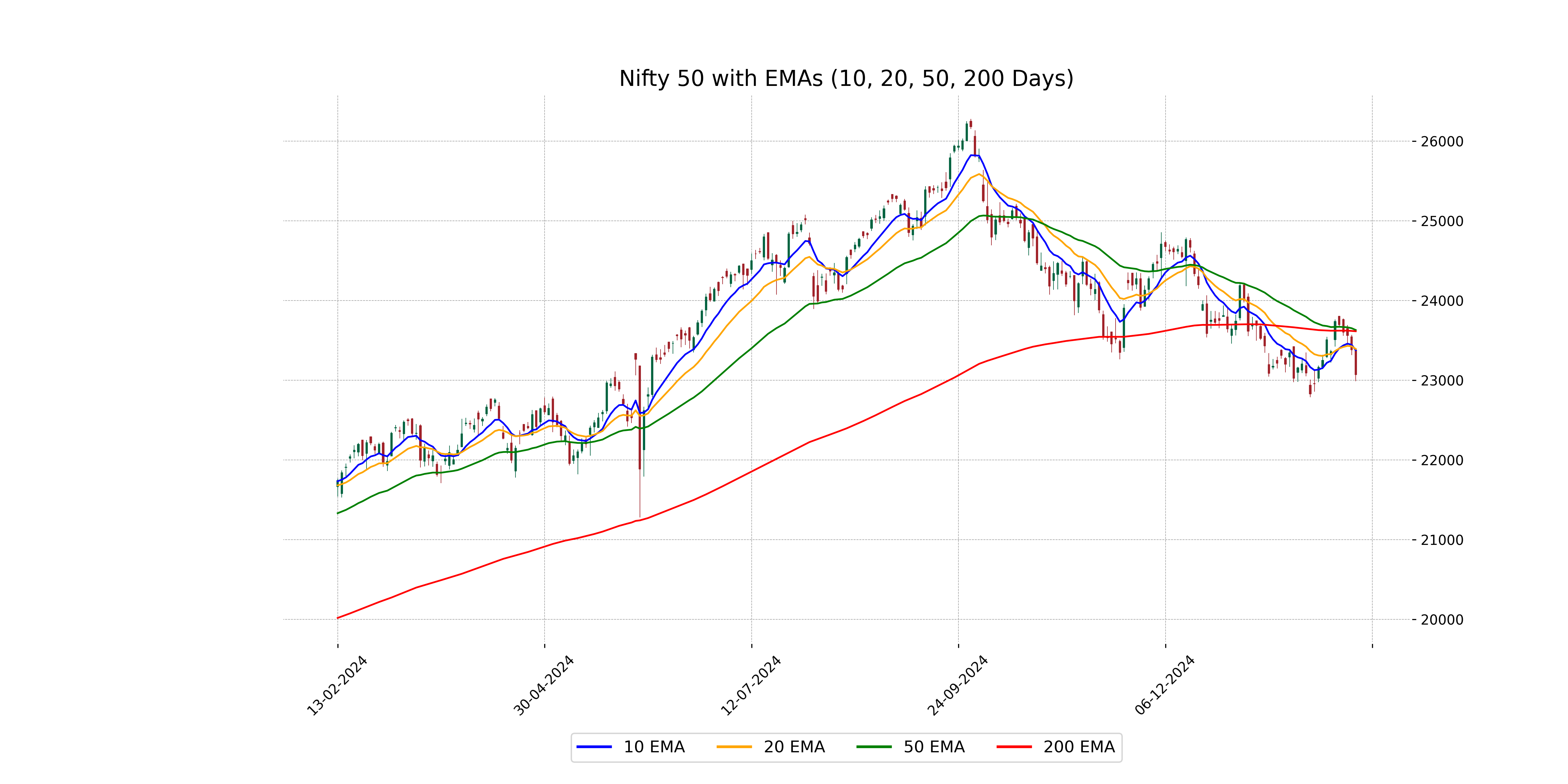 Nifty 50 opened at 23383.55 and closed at 23071.80, marking a decline of approximately 1.32% with a points change of -309.80. The Relative Strength Index stands at 41.42, suggesting weakness. The current levels are below both the 50-day and 200-day EMAs, indicating a bearish trend.
