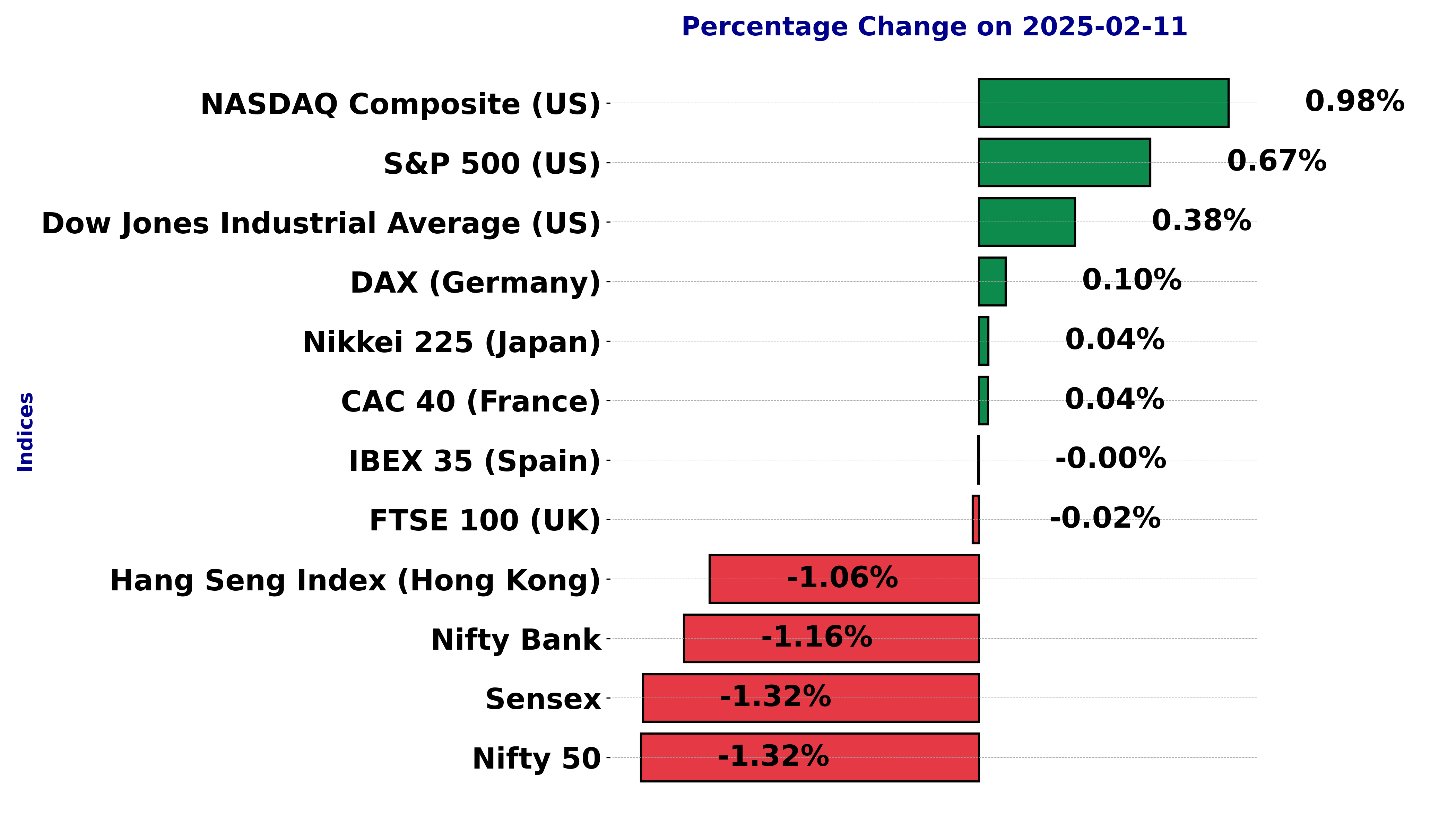 The international stock market indices showed varied performances on February 11, 2025, reflecting the economic sentiment across different regions.