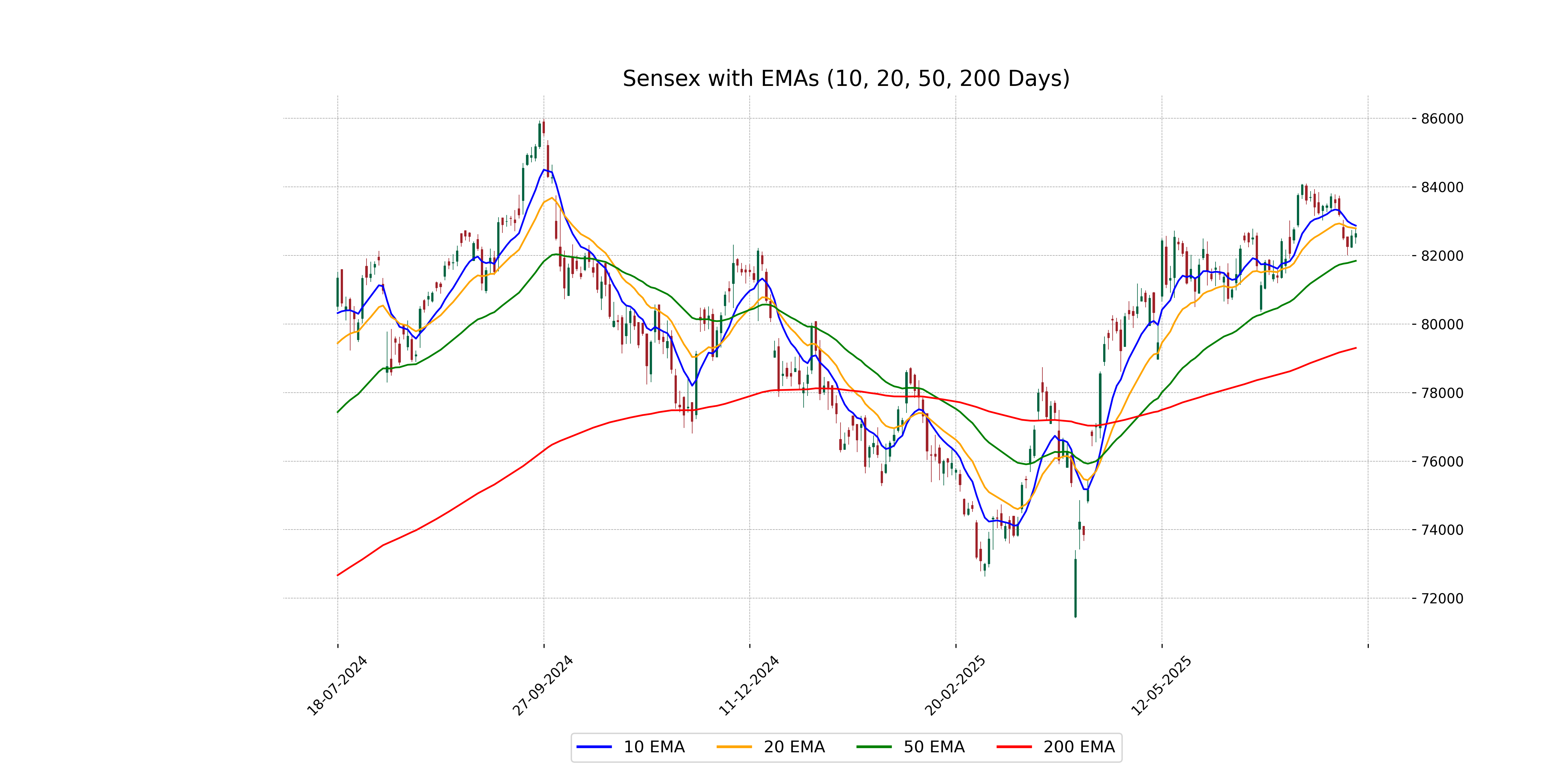 The closing price of Sensex at 82,634.48 is above the 50 EMA at 81,841.85 and the 200 EMA at 79,300.58, indicating a potential longer-term uptrend. However, it is slightly below the 10 EMA at 82,868.97 and near the 20 EMA at 82,788.79, suggesting some short-term resistance or consolidation.