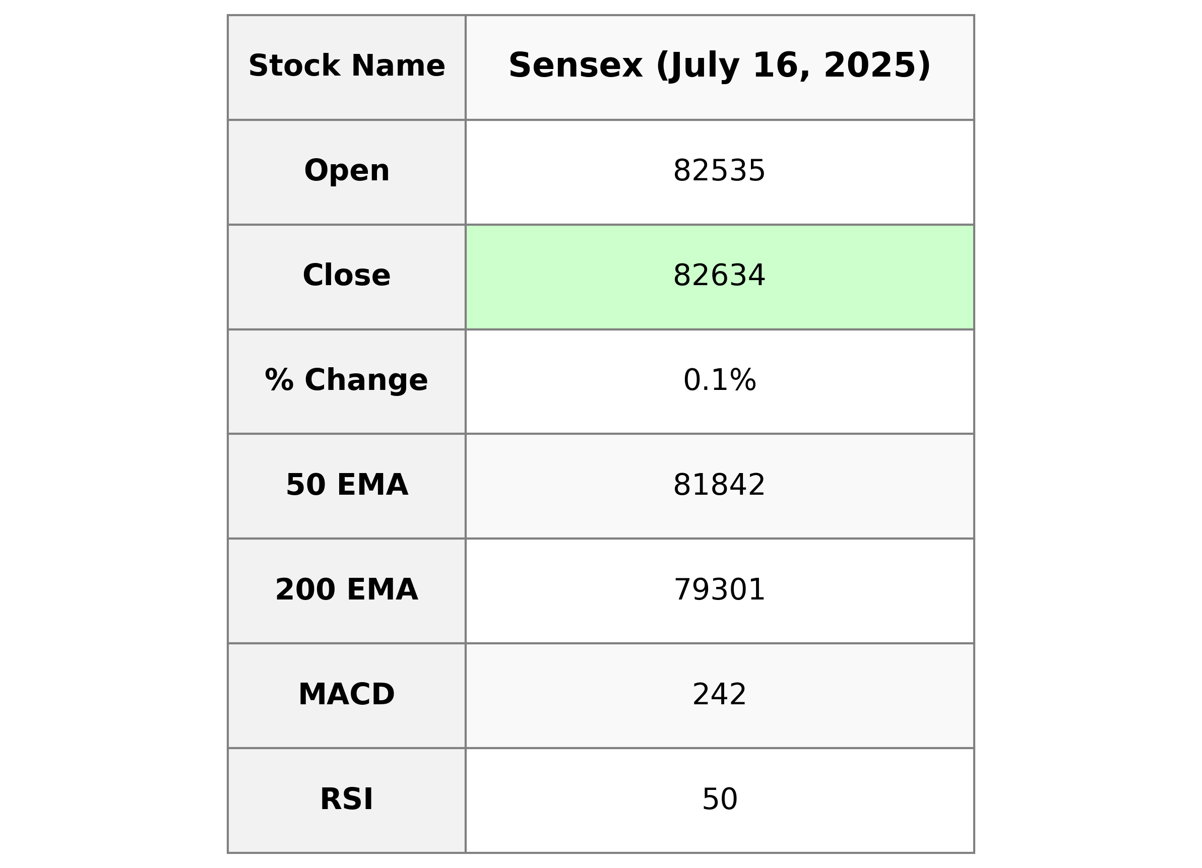The Sensex opened at 82,534.66, reaching a high of 82,784.75 and a low of 82,342.94, before closing at 82,634.48. The index experienced a slight increase, with a percentage change of 0.08% and a points change of 63.57. The RSI indicates neutral market momentum at 50.25, while the MACD suggests a bearish divergence.