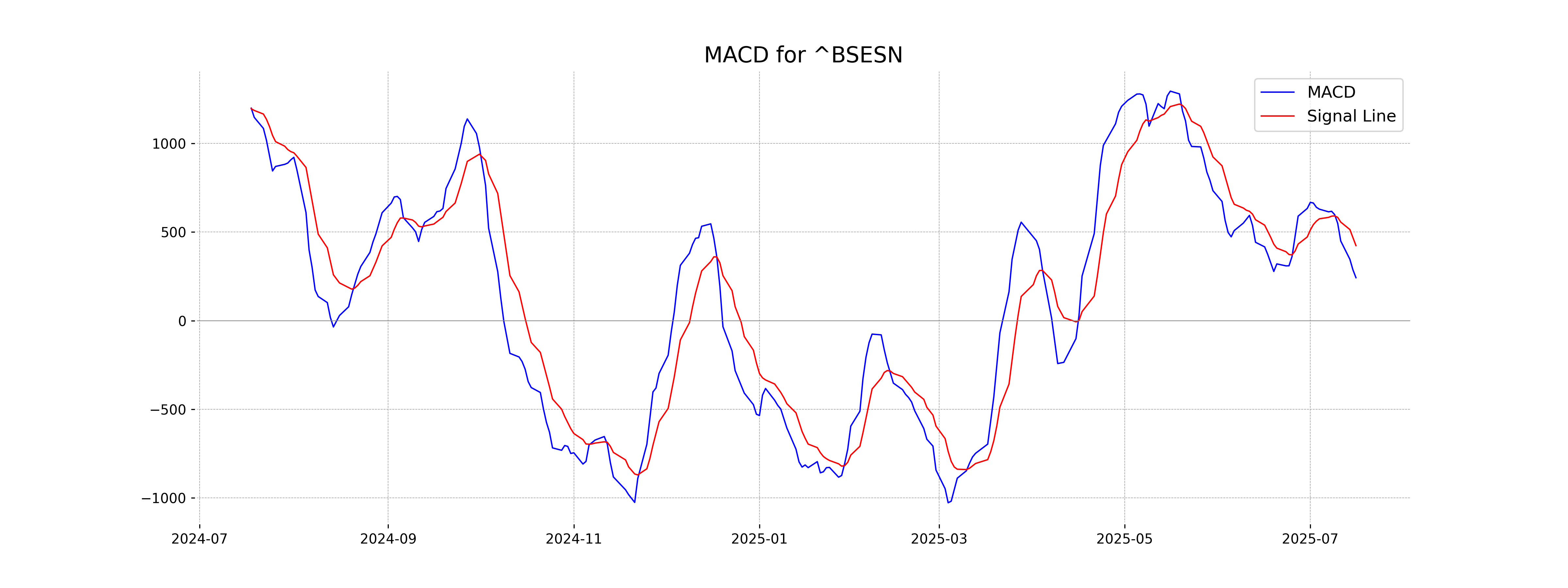 Based on the provided stock data for Sensex, the MACD value is 242.258, which is below the MACD Signal of 423.377. This indicates a bearish signal, suggesting potential downward momentum in the market.