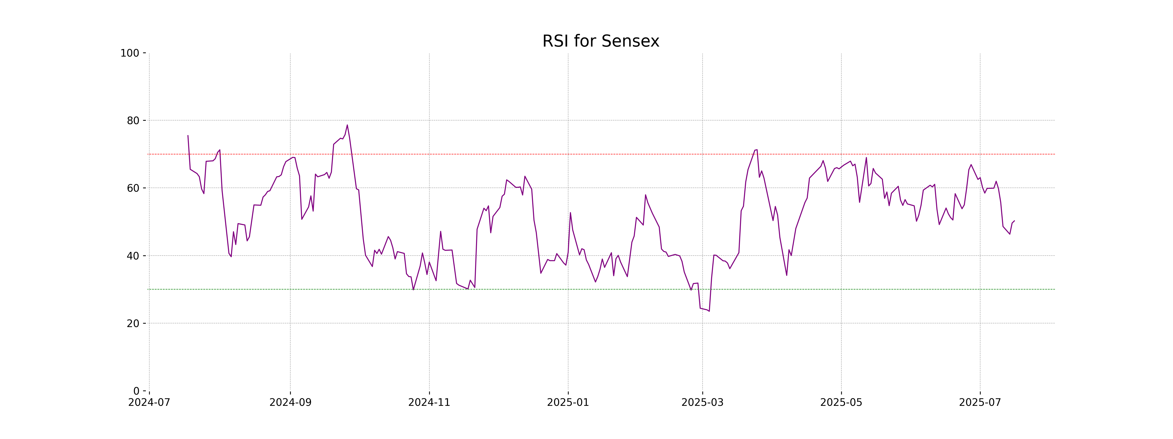 Based on the stock data for Sensex, the Relative Strength Index (RSI) is 50.25, indicating a neutral market condition. This value suggests that there is no significant momentum or trend, as it is near the midpoint of the typical RSI range of 30 to 70.