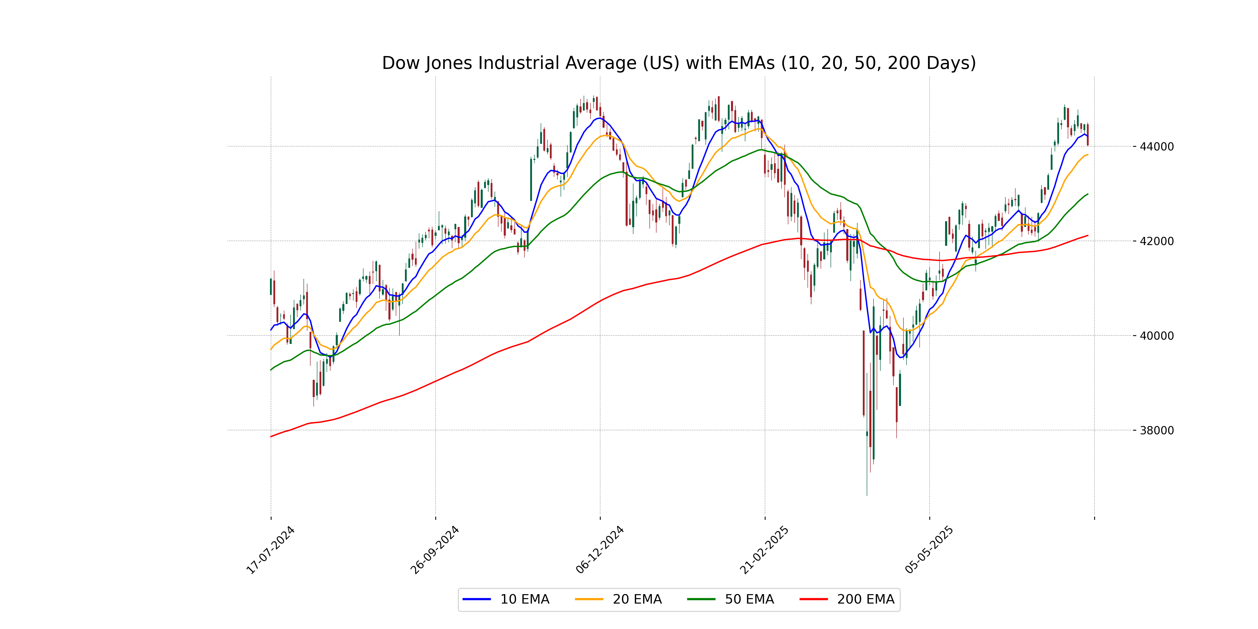 The Dow Jones Industrial Average closed below its 10 EMA at 44,023.29, indicating recent downward momentum. However, it remains well above its 50 EMA and 200 EMA, showing overall longer-term positive trends.