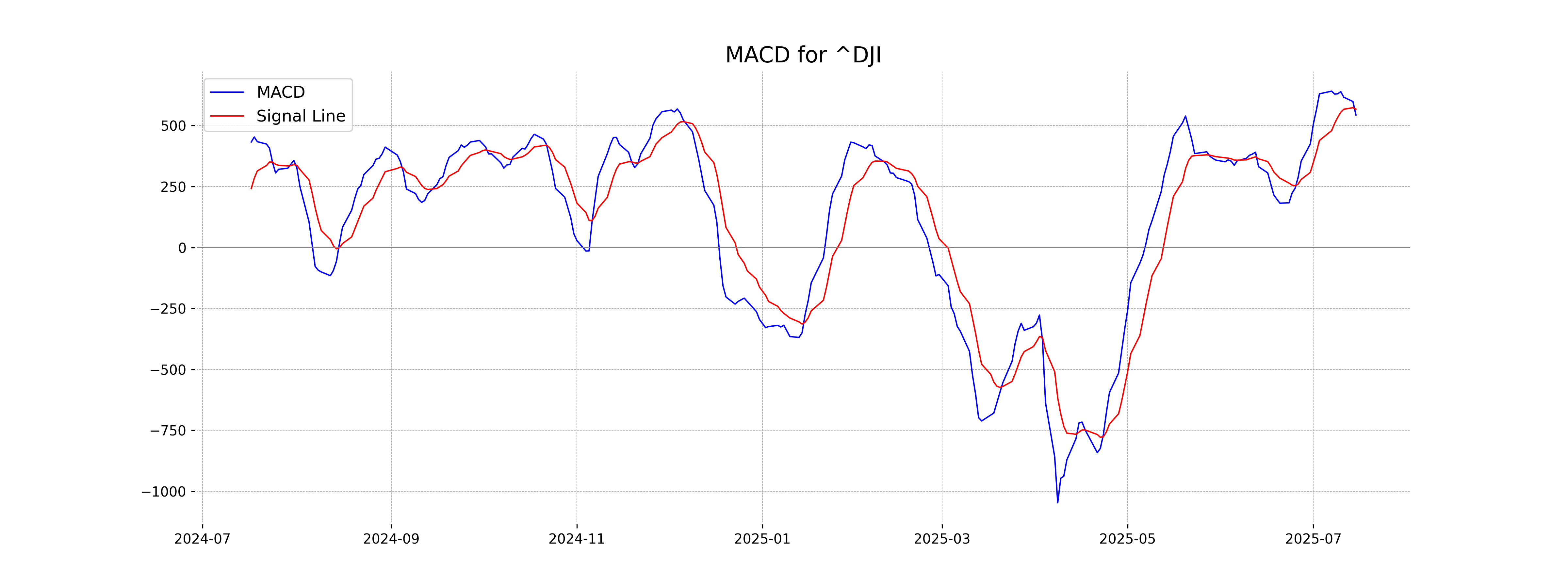 The Dow Jones Industrial Average (US) shows a bearish signal in the MACD analysis. The MACD line at 543.07 is below the MACD signal line at 567.19, indicating a potential downtrend. Traders might consider this as a signal to be cautious in the short term.