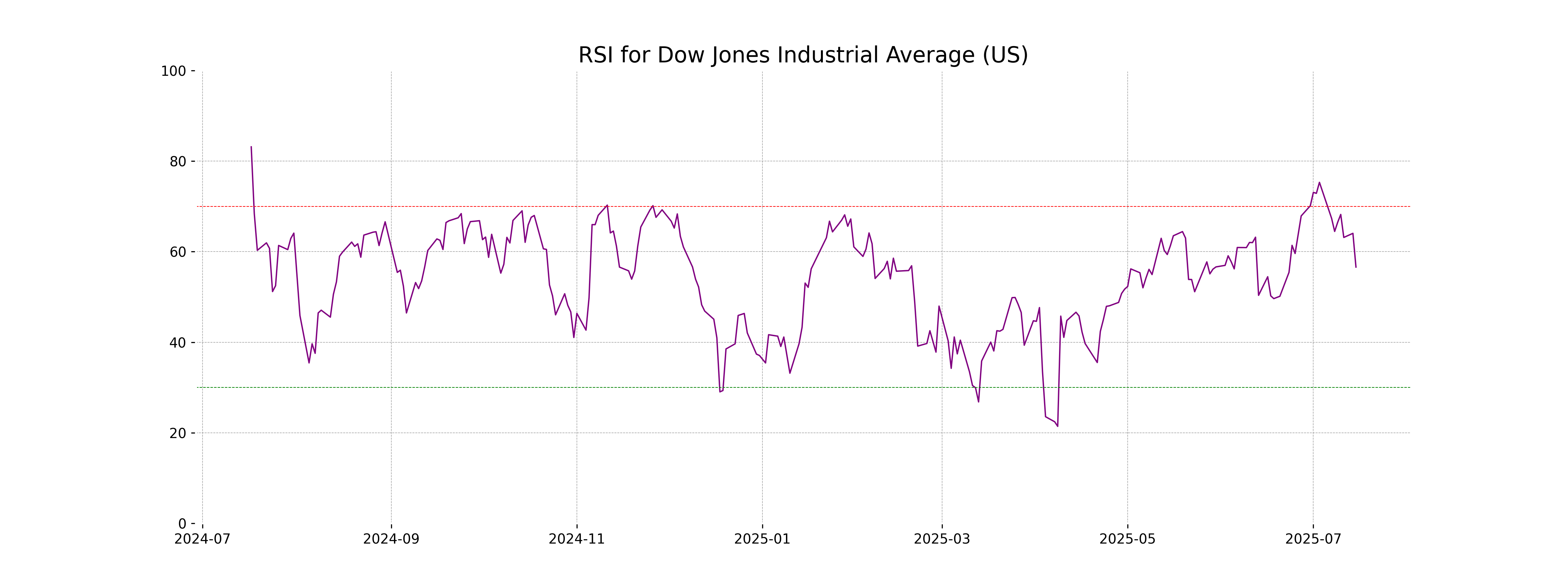 The RSI for the Dow Jones Industrial Average is 56.59, indicating a neutral momentum. Generally, an RSI between 30 and 70 suggests neither overbought nor oversold conditions, and currently, the index is comfortably within this range.