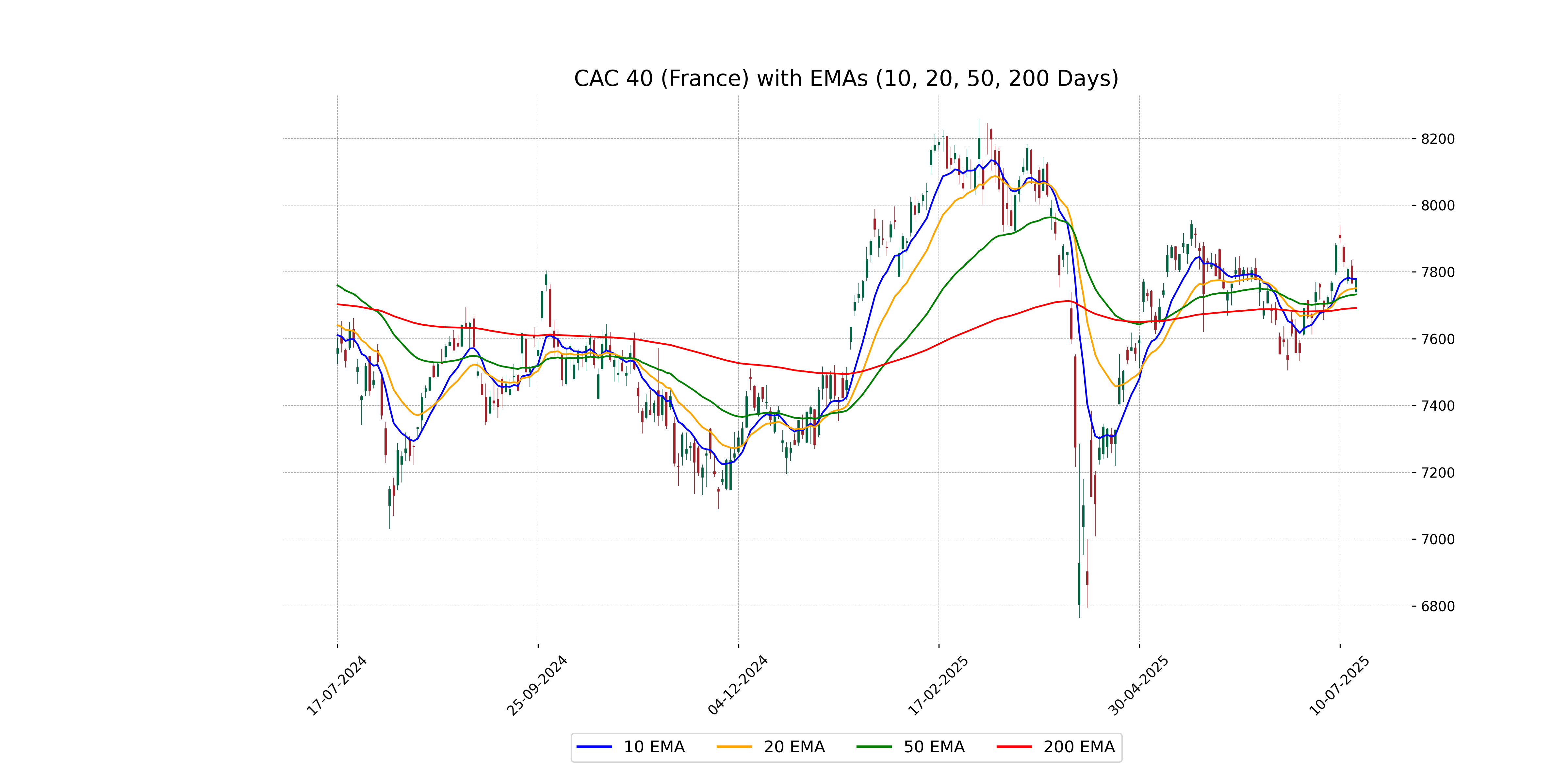 CAC 40 (France) closed above its 50 EMA and 200 EMA but below its 10 EMA, indicating a predominantly bullish position relative to these moving averages. The current RSI of 52.88 suggests a moderately neutral momentum.