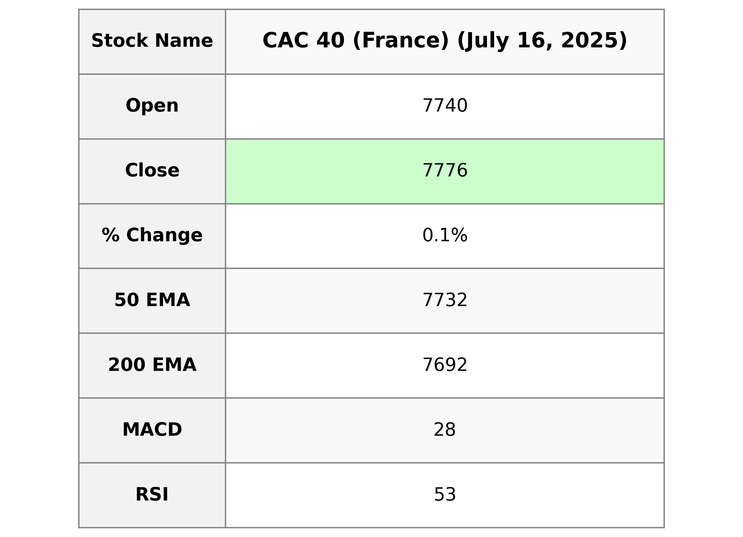 CAC 40's performance shows a closing value of 7776.20, marking a slight increase of 0.13% from the previous close. The index experienced a high of 7776.20 and a low of 7736.17, with no reported trading volume. The RSI stands at 52.88, suggesting neither overbought nor oversold conditions, while the MACD value of 27.98 indicates a positive trend above its signal line.