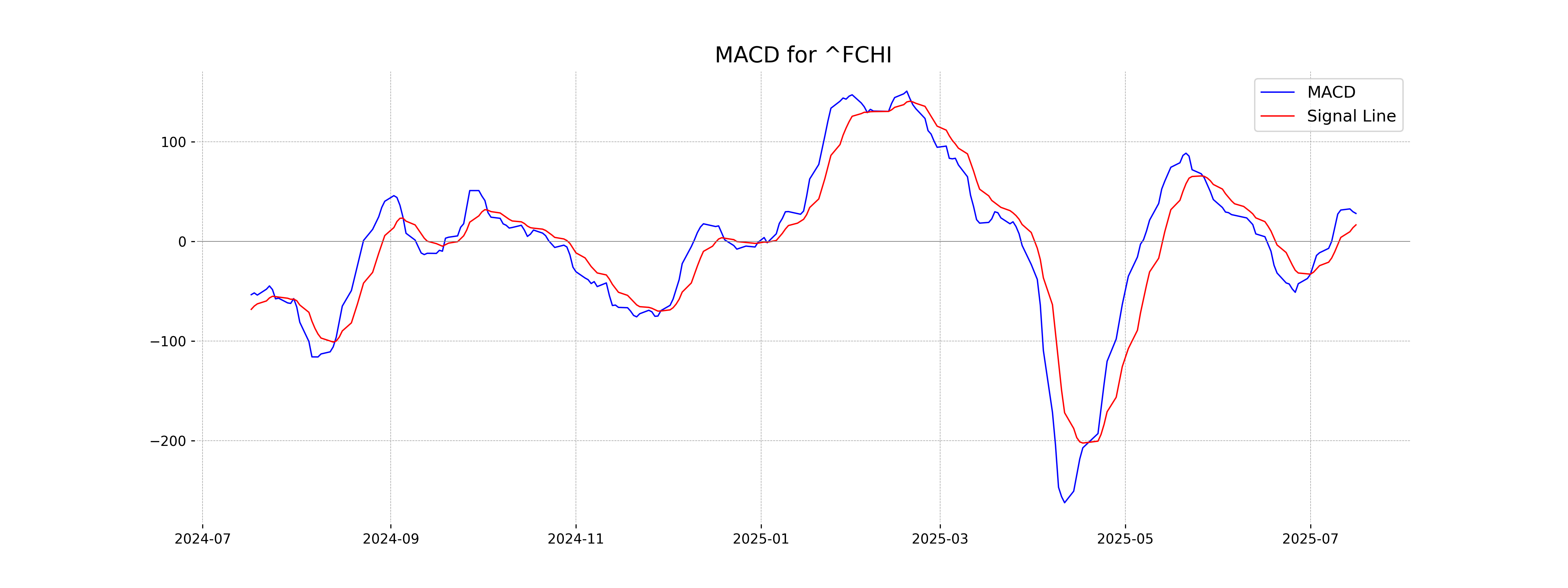 For the CAC 40 (France), the MACD value is 27.98, which is higher than the MACD Signal of 16.52. This indicates a bullish trend, suggesting that the price may continue to rise if the current momentum persists.