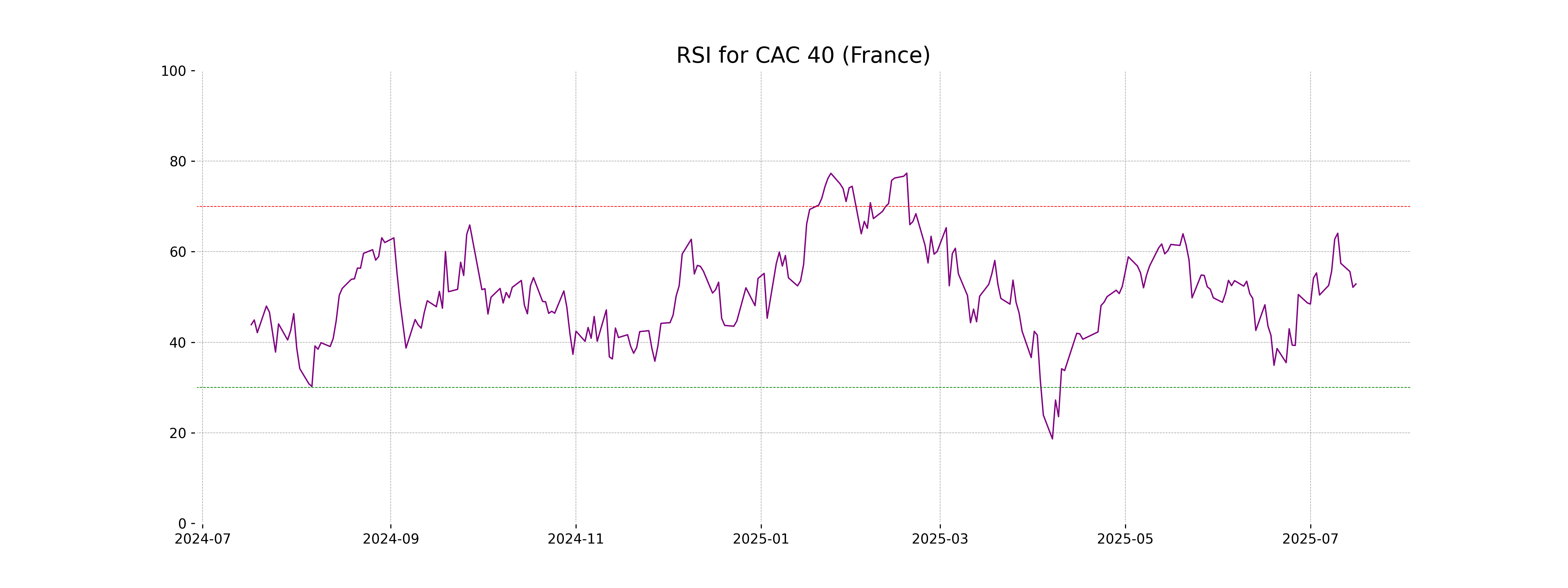 CAC 40 RSI Analysis: The RSI of CAC 40 currently stands at 52.88, indicating a neutral market condition. This suggests that the index is not in overbought or oversold territory, and price momentum is balanced.
