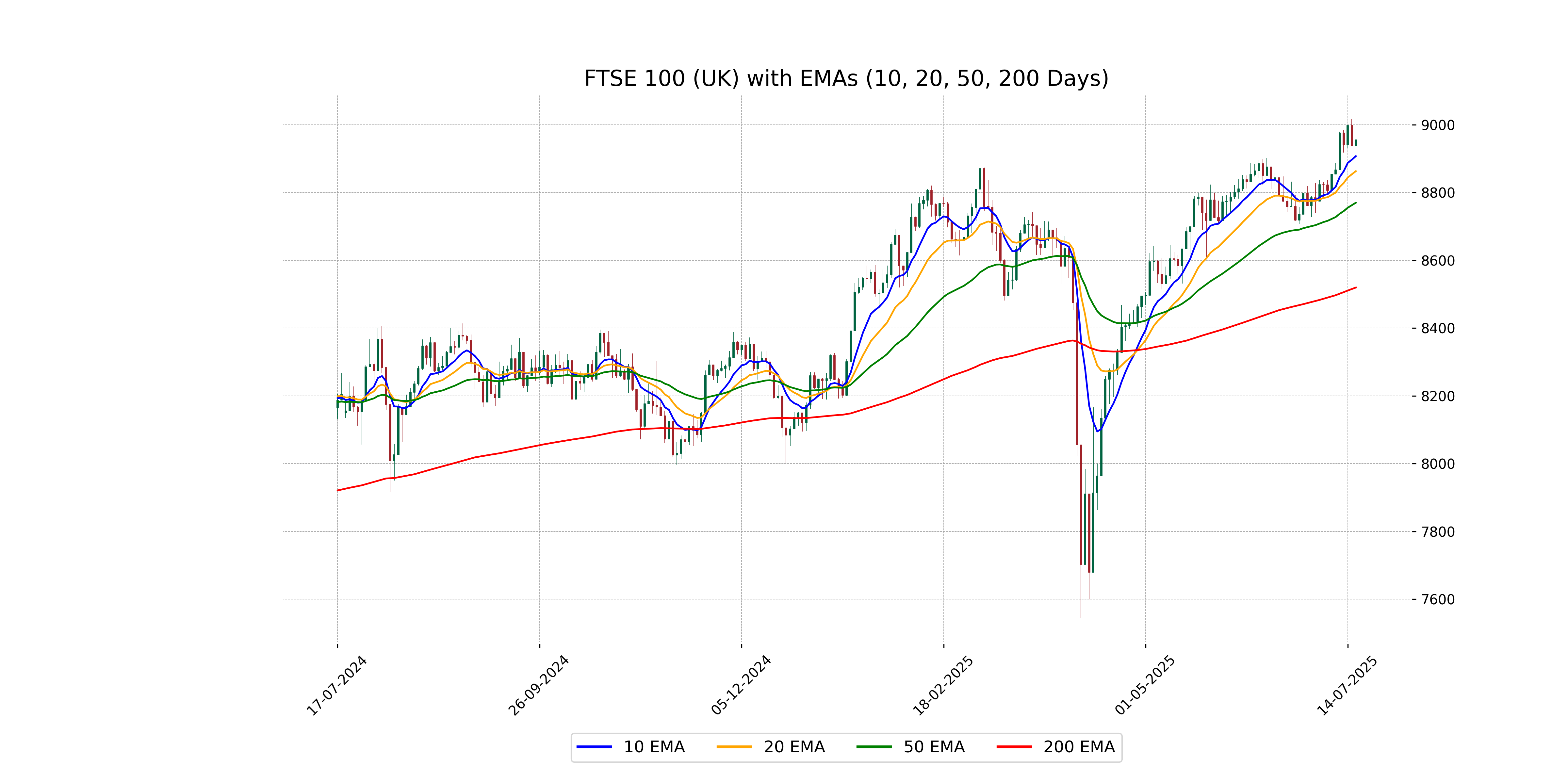 The FTSE 100 (UK) is trading above its 10-day EMA of 8907.52 and 20-day EMA of 8863.20, indicating short-term bullish momentum. Additionally, it is trading higher than both its 50-day EMA of 8770.08 and 200-day EMA of 8519.77, which suggests a longer-term uptrend is present.
