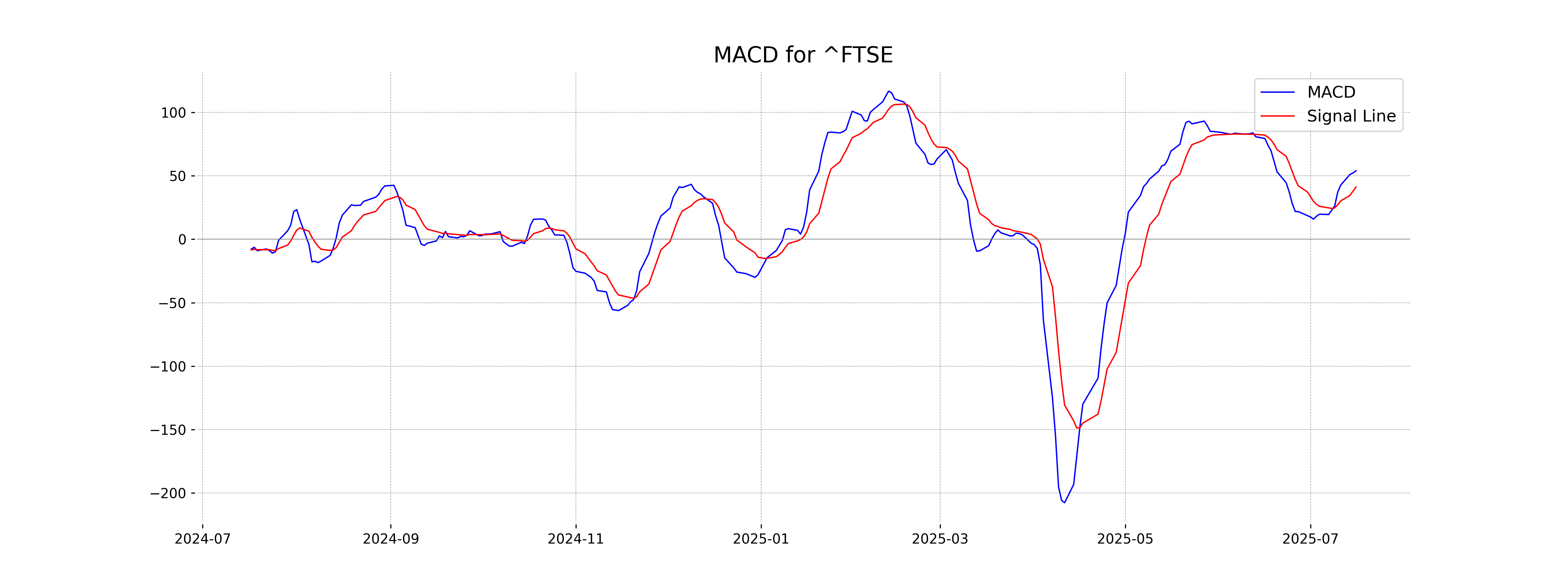 FTSE 100 (UK): The MACD value of 53.91, which is above the MACD Signal line at 41.19, indicates a bullish momentum in the market. This suggests that upward price movement is gaining strength.