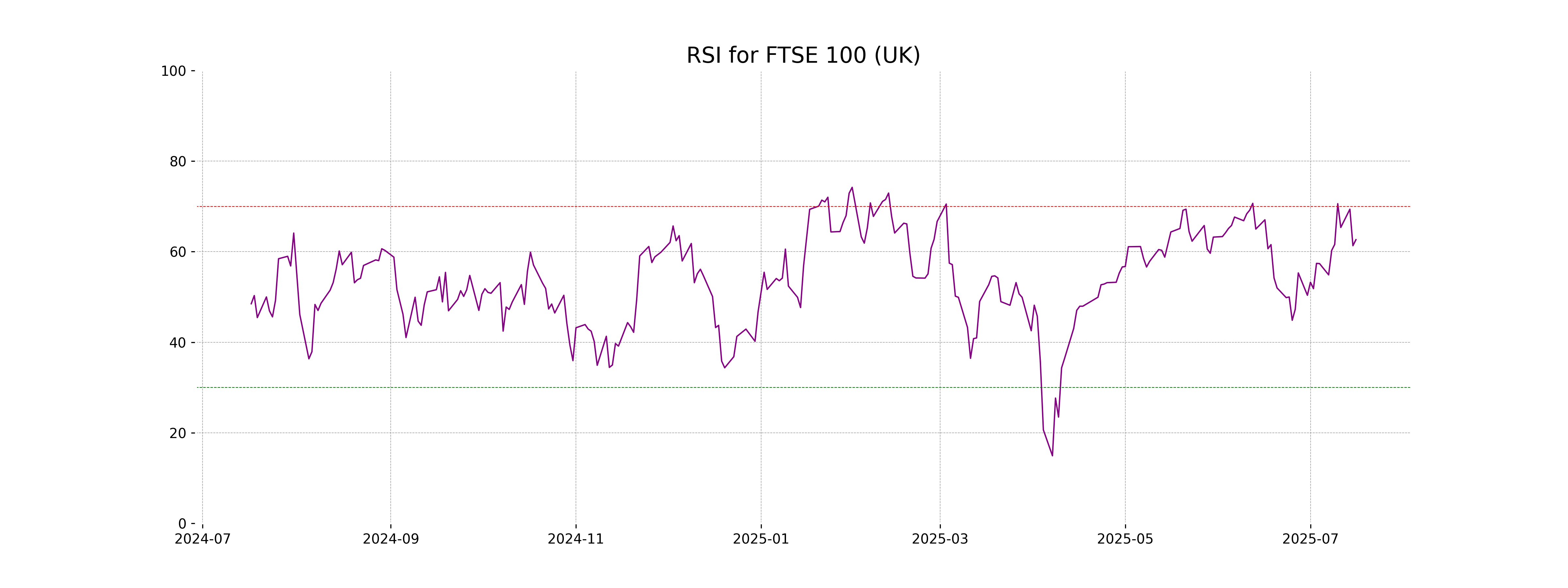 RSI Analysis for FTSE 100 (UK): The RSI for FTSE 100 is currently at 62.65, which indicates that the index is in a moderately strong position. An RSI value above 70 may suggest the index is overbought, while below 30 may suggest it is oversold.