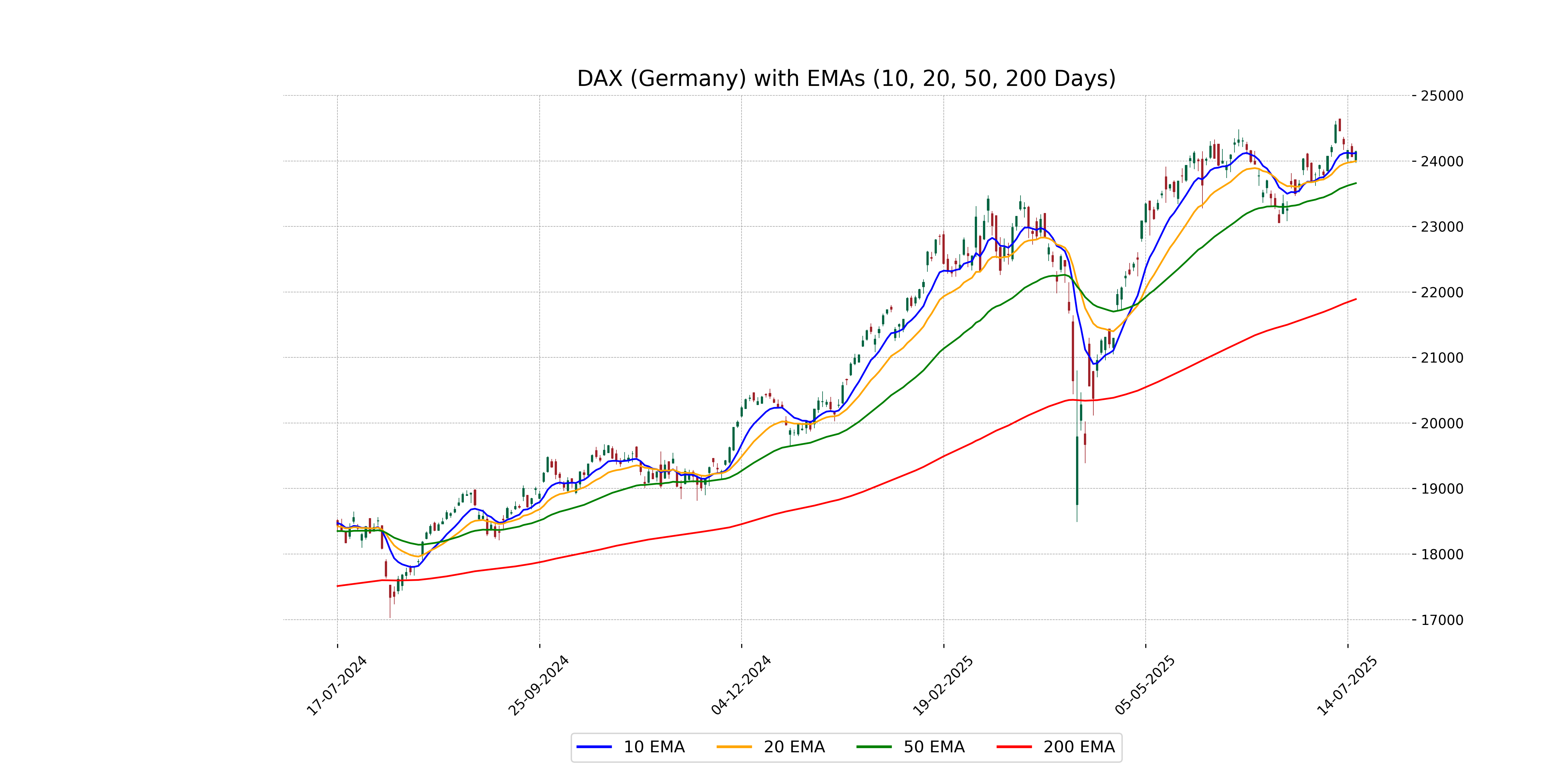 The DAX (Germany) closed above its 50 EMA (23,660.23) and 200 EMA (21,890.48), suggesting a bullish short-term trend. It also closed above its 10 EMA (24,118.67) and 20 EMA (23,997.42), indicating continued upward momentum.