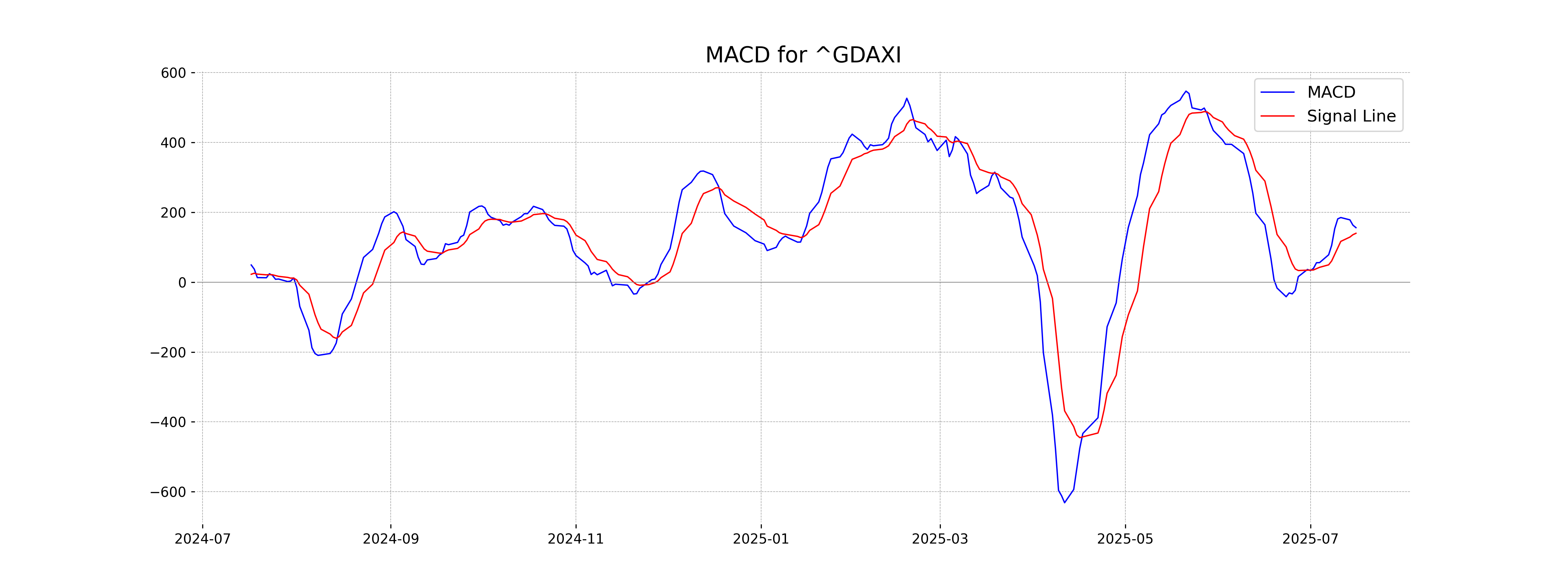 The MACD value for DAX (Germany) is 156.13, which is above the MACD Signal value of 140.00, suggesting a bullish trend. This indicates potential positive momentum, as the MACD line is above the signal line.