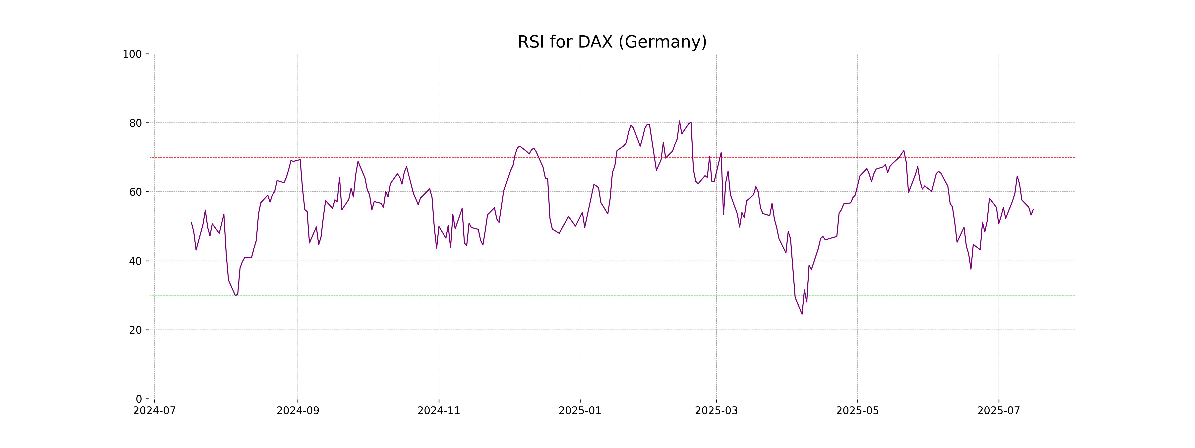 The RSI value for DAX (Germany) is 54.91, indicating it is in the neutral range. This suggests that the market is neither overbought nor oversold, implying potential stability in the short term. Investors may consider additional factors for a comprehensive decision.