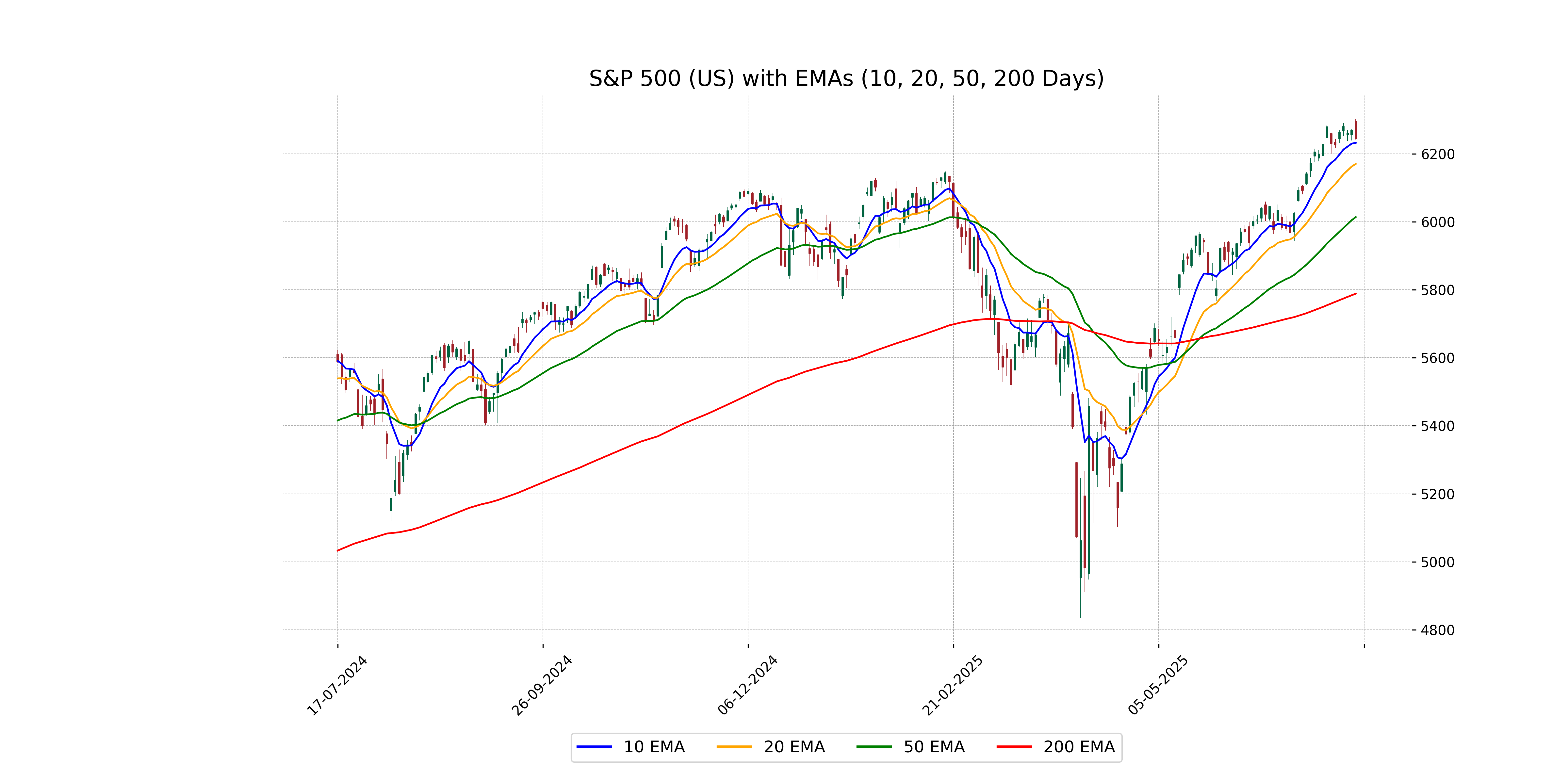 The S&P 500 opened at 6295.29 and closed slightly lower at 6243.76, below its 10-day EMA (6232.21), indicating recent downward movement. The closing price is above both the 50-day EMA (6013.89) and the 200-day EMA (5788.58), reflecting a longer-term uptrend despite the short-term pullback.