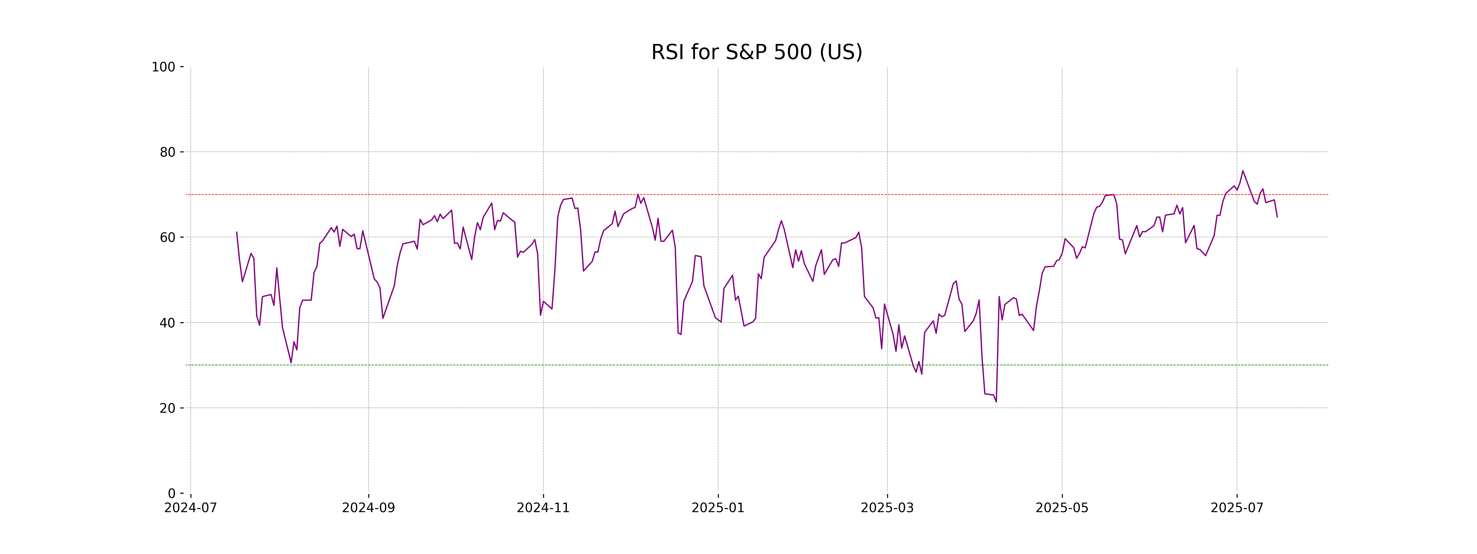 The RSI for S&P 500 is 64.75, indicating a moderately strong momentum. Since RSI values above 70 might suggest overbought conditions and below 30 might suggest oversold conditions, the index is currently not in overbought territory and suggests a neutral to slightly bullish trend.