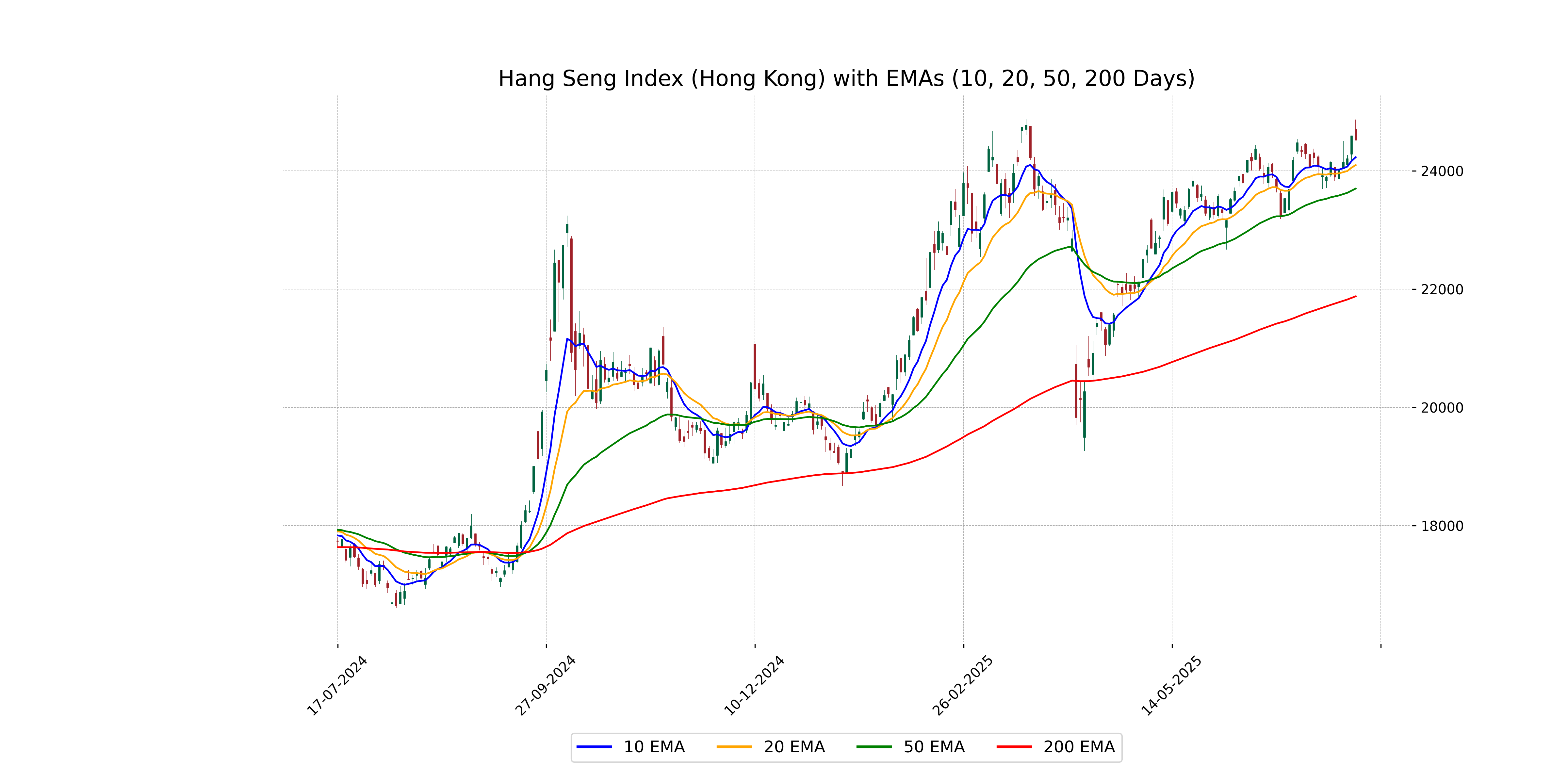 The closing value of Hang Seng Index is 24,517.76, which is above the 50 EMA (23,699.11) and the 200 EMA (21,878.19), indicating a bullish trend in the short to medium term. However, it is below the 10 EMA (24,229.34) and 20 EMA (24,096.78), suggesting recent short-term bearish pressure.