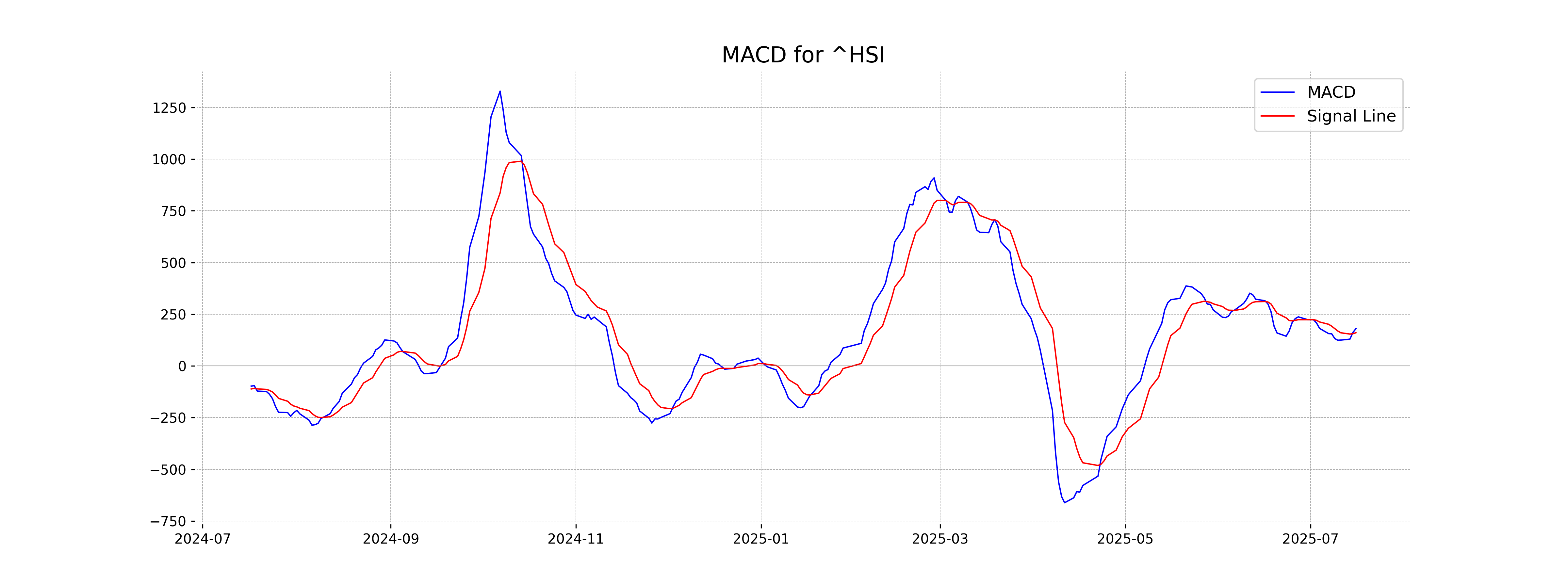 The Hang Seng Index opened at 24,704.05 and closed at 24,517.76, marking a decrease of 72.36 points or a -0.29% change from the previous close of 24,590.12. The index saw a high of 24,867.81 and a low of 24,517.75, with a significant RSI of 60.22 indicating moderate momentum and a positive MACD reflecting bullish market conditions.