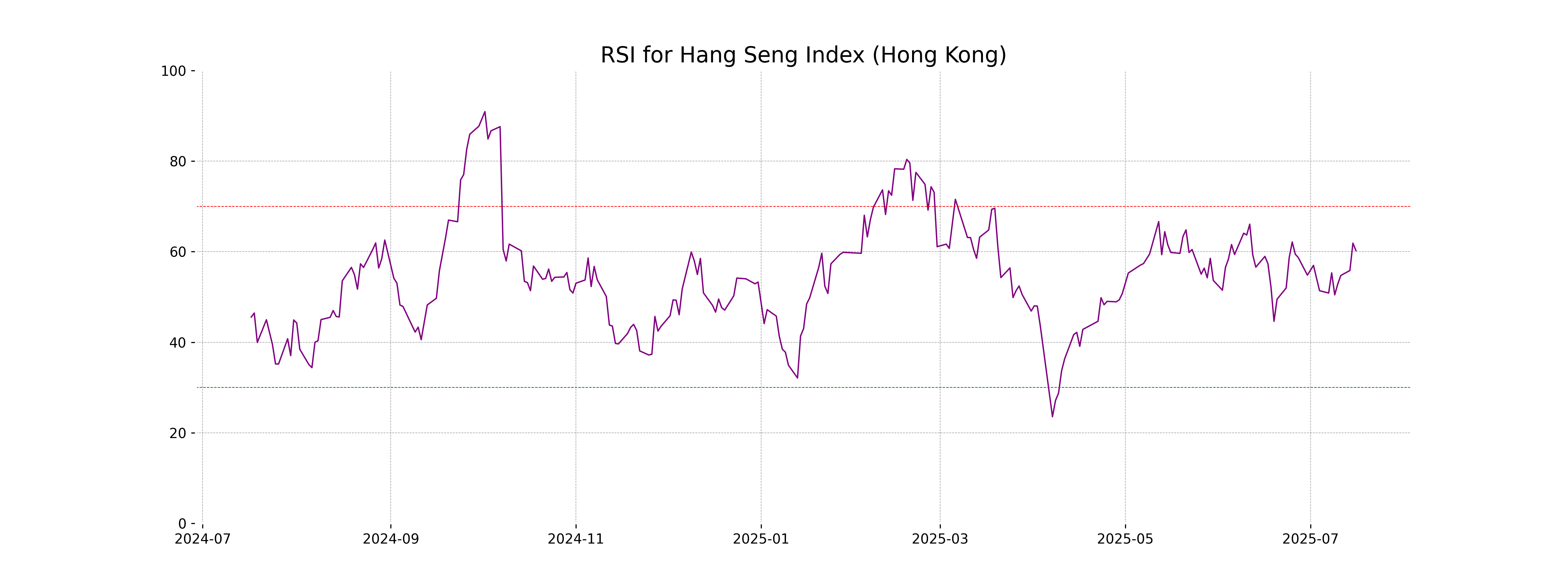 RSI Analysis for Hang Seng Index (Hong Kong): The RSI value for the Hang Seng Index is 60.22, which indicates a neutral to slightly bullish momentum. Generally, an RSI value above 50 suggests more buying pressure than selling pressure, but it is not yet in the overbought territory that typically begins at an RSI above 70.