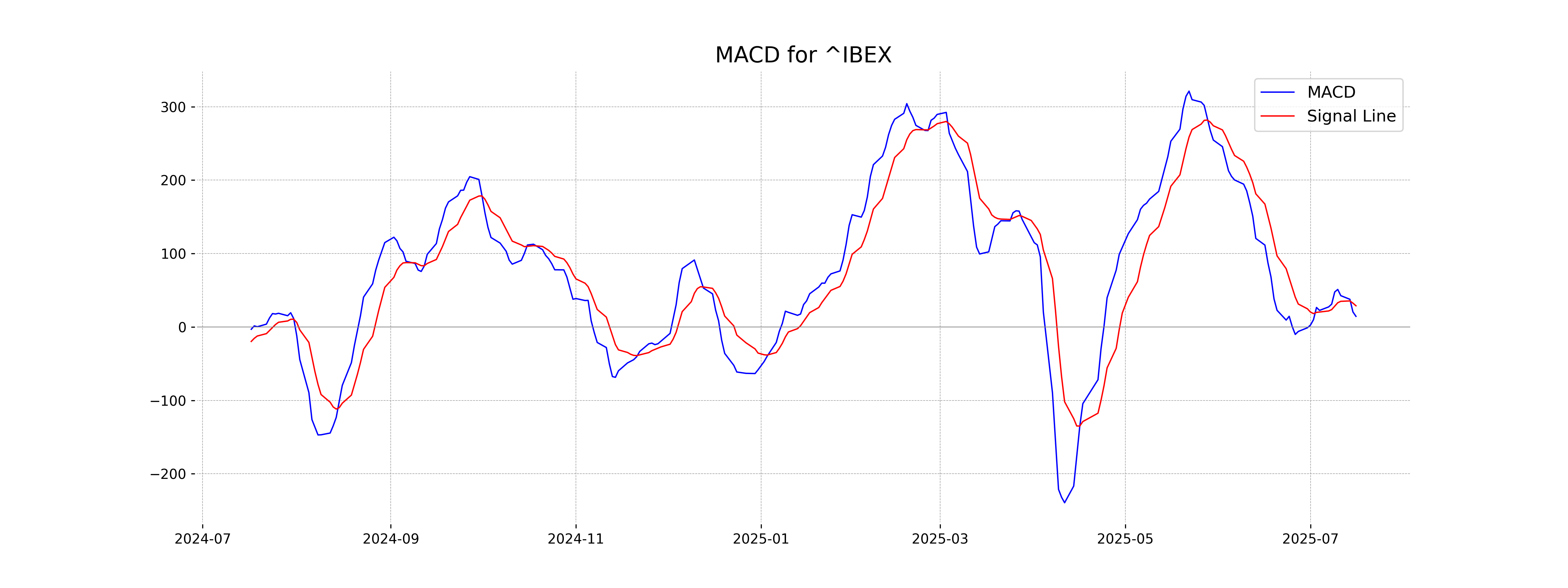 For IBEX 35 (Spain), the MACD value is lower than the MACD Signal line, which may indicate bearish momentum. This divergence suggests that the index may experience some downward pressure in the short term.