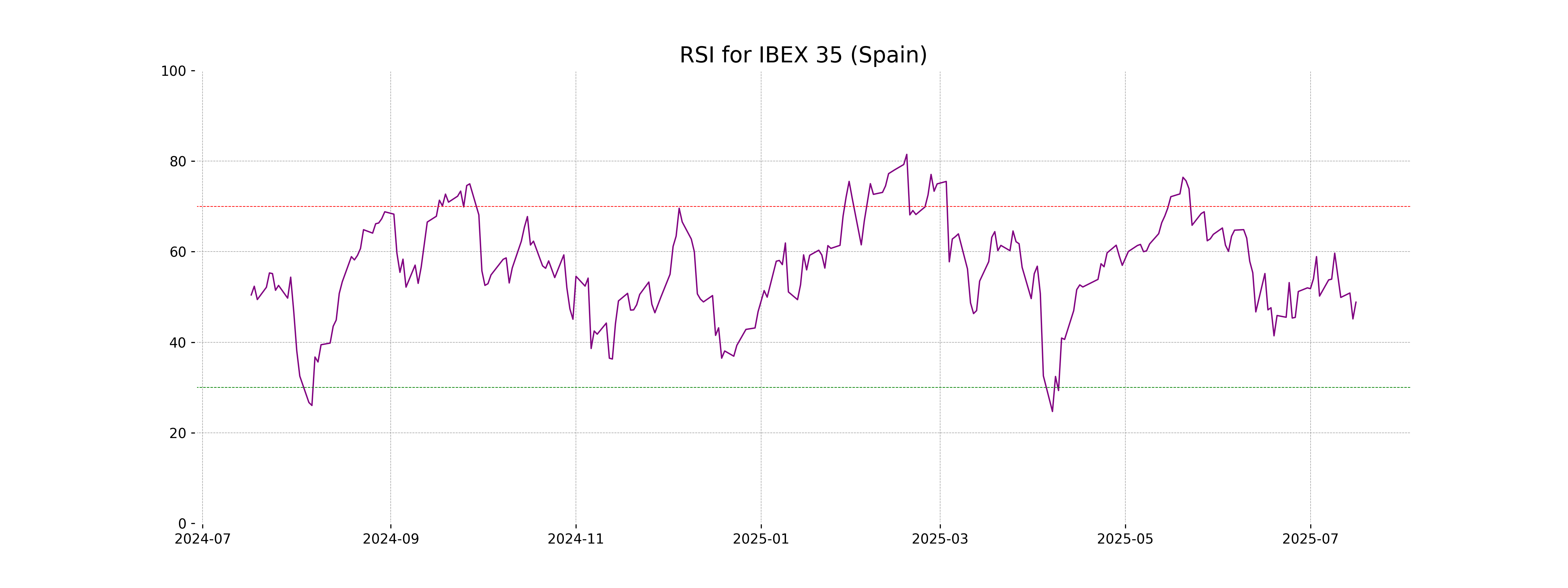 The RSI for IBEX 35 (Spain) is 48.85, which indicates that the index is in a neutral zone and not currently overbought or oversold. This suggests a balanced momentum with no immediate reversal signals based on RSI alone.